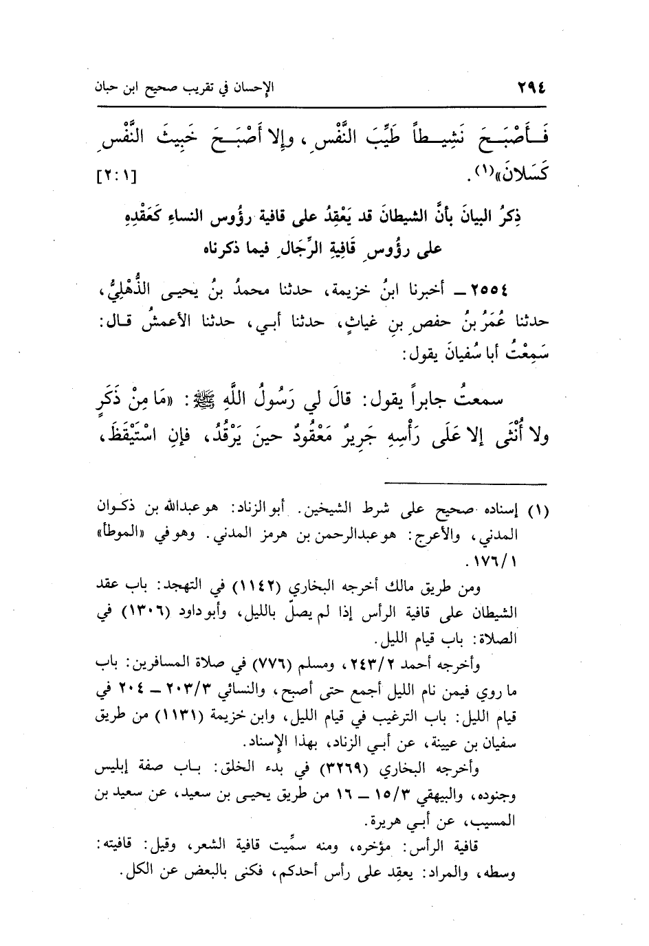 2554 - أَخْبَرَنَا ابْنُ خُزَيْمَةَ، حَدَّثَنَا مُحَمَّدُ بْنُ يَحْيَى الذُّهْلِيُّ، حَدَّثَنَا عُمَرُ بْنُ حَفْصِ بْنِ غِيَاثٍ، حَدَّثَنَا أَبِي، حَدَّثَنَا الْأَعْمَشُ، قَالَ: سَمِعْتُ أَبَا سُفْيَانَ يَقُولُ: سَمِعْتُ جَابِرًا يَقُولُ: قَالَ لِي رَسُولُ اللَّهِ صَلَّى اللَّهُ عَلَيْهِ وَسَلَّمَ: «مَا مِنْ ذَكَرٍ وَلَا أُنْثَى إِلَّا عَلَى رَأْسِهِ جَرِيرٌ مَعْقُودٌ حِينَ يَرْقُدُ، فَإِنِ اسْتَيْقَظَ