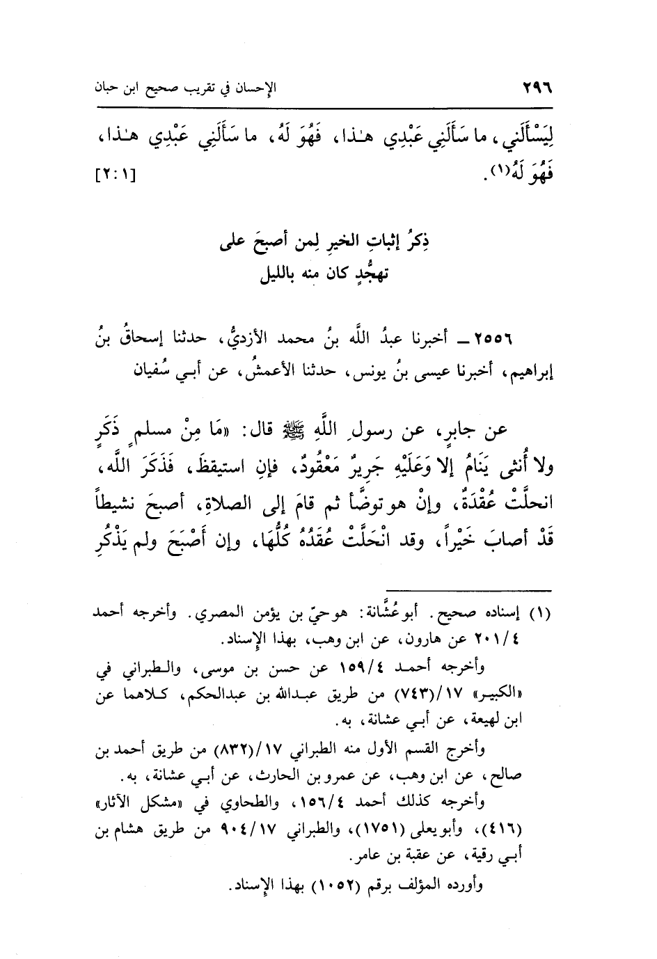 2556 - أَخْبَرَنَا عَبْدُ اللَّهِ بْنُ مُحَمَّدٍ الْأَزْدِيُّ، حَدَّثَنَا إِسْحَاقُ بْنُ إِبْرَاهِيمَ، أَخْبَرَنَا عِيسَى بْنُ يُونُسَ، حَدَّثَنَا الْأَعْمَشُ، عَنْ أَبِي سُفْيَانَ، عَنْ جَابِرٍ، عَنْ رَسُولِ اللَّهِ صَلَّى اللَّهُ عَلَيْهِ وَسَلَّمَ قَالَ: «مَا مِنْ مُسْلِمٍ، ذَكَرٍ وَلَا أُنْثَى، يَنَامُ إِلَّا وَعَلَيْهِ جَرِيرٌ مَعْقُودٌ، فَإِنِ اسْتَيْقَظَ فَذَكَرَ اللَّهَ، انْحَلَّتْ عُقْدَةٌ، وَإِنْ هُوَ تَوَضَّأَ ثُمَّ قَامَ إِلَى الصَّلَاةِ أَصْبَحَ نَشِيطًا قَدْ أَصَابَ خَيْرًا، وَقَدِ انْحَلَّتْ عُقَدُهُ كُلُّهَا، وَإِنْ أَصْبَحَ وَلَمْ يَذْكُرِ