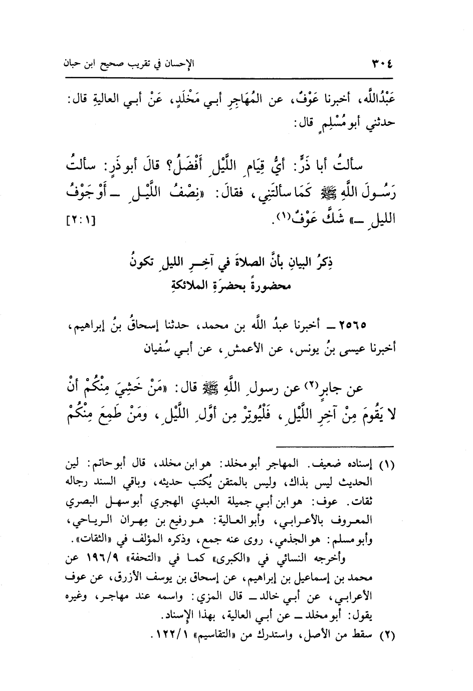 عَبْدُ اللَّهِ، أَخْبَرَنَا عَوْفٌ، عَنِ الْمُهَاجِرِ أَبِي مَخْلَدٍ، عَنْ أَبِي الْعَالِيَةِ، قَالَ: حَدَّثَنِي أَبُو مُسْلِمٍ، قَالَ: سَأَلْتُ أَبَا ذَرٍّ: أَيُّ قِيَامِ اللَّيْلِ أَفْضَلُ؟ قَالَ أَبُو ذَرٍّ: سَأَلْتُ رَسُولَ اللَّهِ صَلَّى اللَّهُ عَلَيْهِ وَسَلَّمَ كَمَا سَأَلْتَنِي، فَقَالَ: «نِصْفُ اللَّيْلِ، أَوْ جَوْفُ اللَّيْلِ» شَكَّ عَوْفٌ (¬1) . [1: 2]