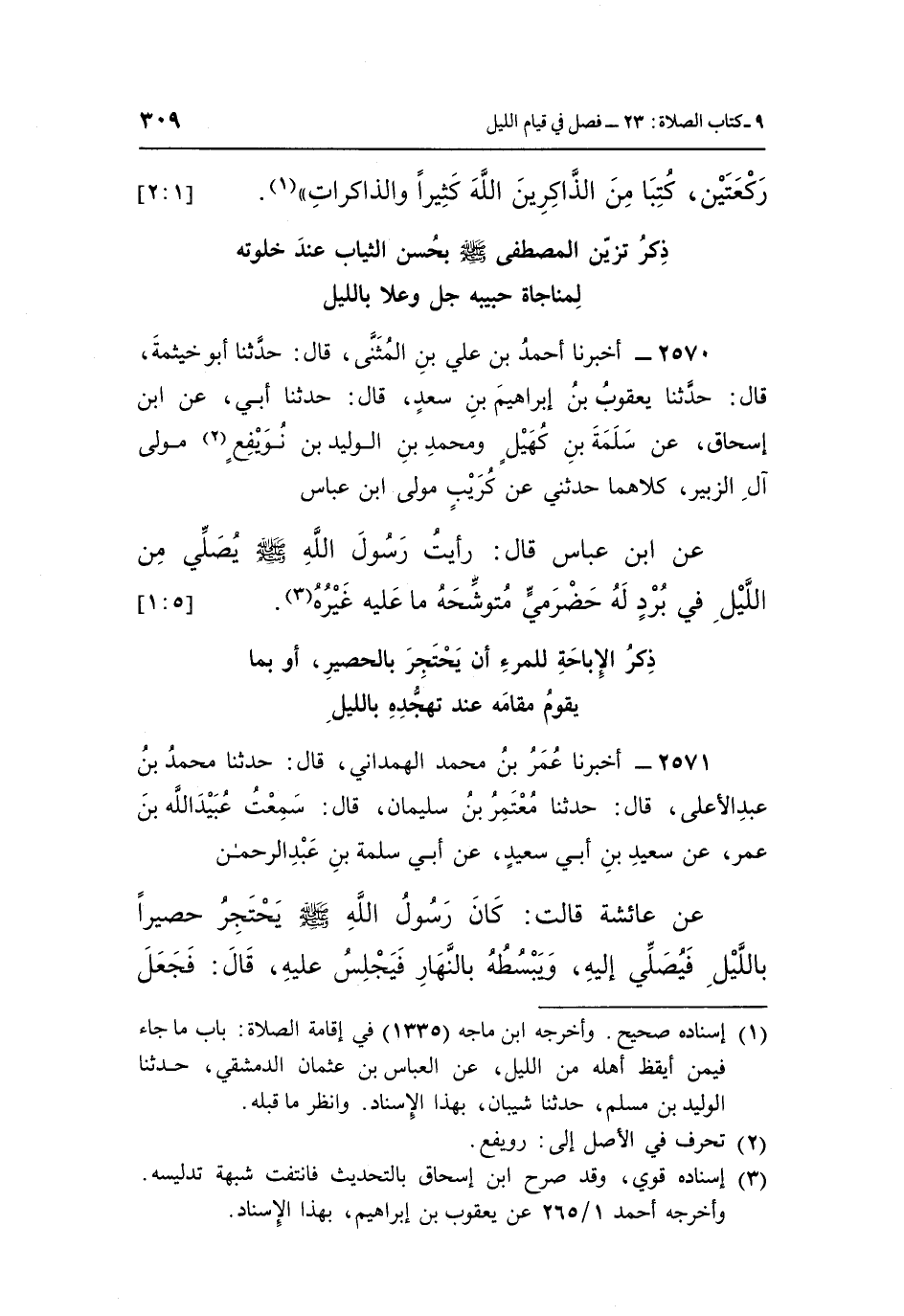 2570 - أَخْبَرَنَا أَحْمَدُ بْنُ عَلِيِّ بْنِ الْمُثَنَّى، قَالَ: حَدَّثَنَا أَبُو خَيْثَمَةَ، قَالَ: حَدَّثَنَا يَعْقُوبُ بْنُ إِبْرَاهِيمَ بْنِ سَعْدٍ، قَالَ: حَدَّثَنَا أَبِي، عَنِ ابْنِ إِسْحَاقَ، عَنْ سَلَمَةَ بْنِ كُهَيْلٍ، وَمُحَمَّدِ بْنِ الْوَلِيدِ بْنِ نُوَيْفِعٍ (¬2) ، مَوْلَى آلِ الزُّبَيْرِ، كِلَاهُمَا حَدَّثَنِي عَنْ كُرَيْبٍ مَوْلَى ابْنِ عَبَّاسٍ، عَنِ ابْنِ عَبَّاسٍ قَالَ: «رَأَيْتُ رَسُولَ اللَّهِ صَلَّى اللَّهُ عَلَيْهِ وَسَلَّمَ يُصَلِّي مِنَ اللَّيْلِ فِي بُرْدٍ لَهُ حَضْرَمِيٍّ مُتَوَشِّحَهُ مَا عَلَيْهِ غَيْرُهُ» (¬3) . [5: 1]