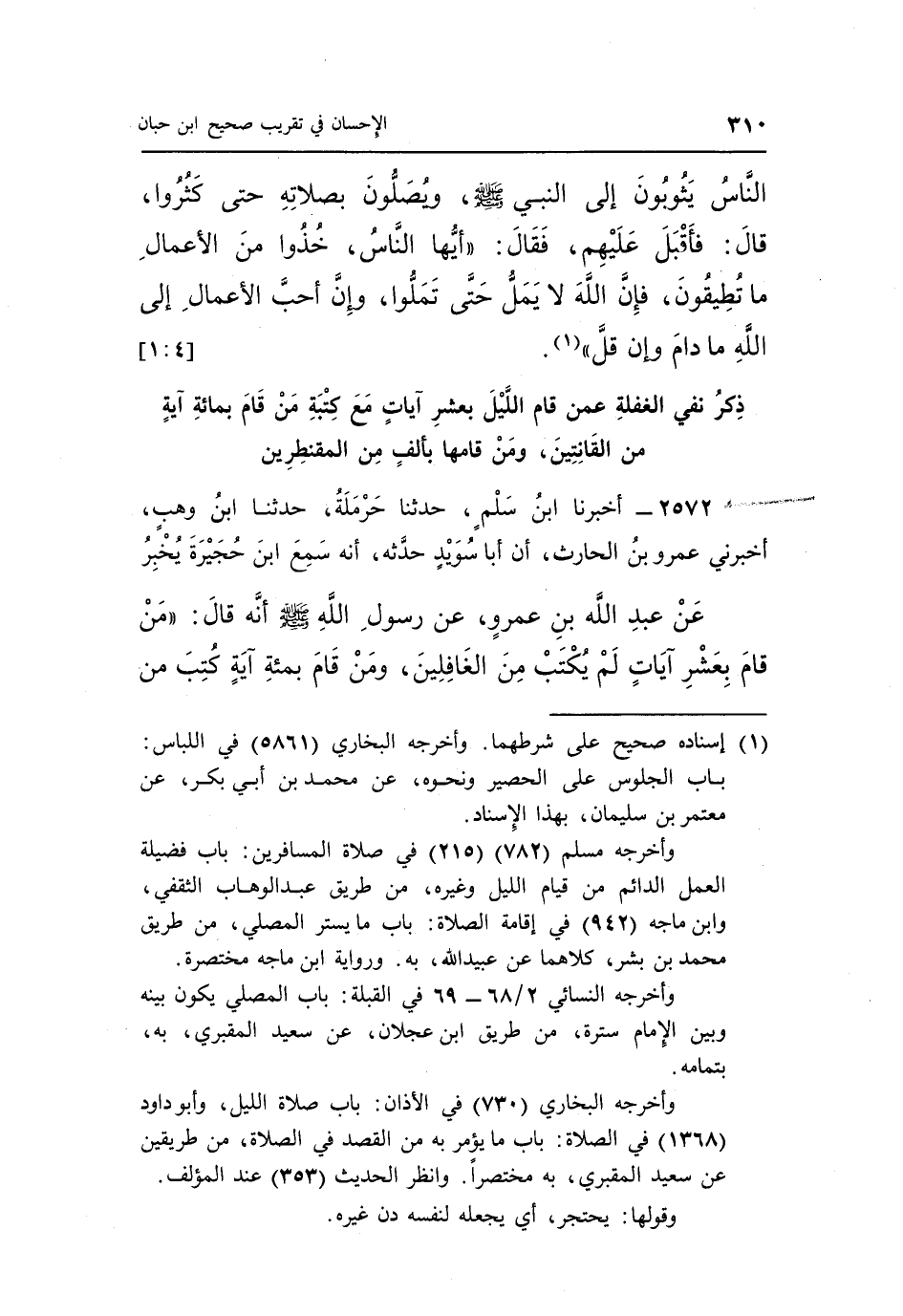 2572 - أَخْبَرَنَا ابْنُ سَلْمٍ، حَدَّثَنَا حَرْمَلَةُ، حَدَّثَنَا ابْنُ وَهْبٍ، أَخْبَرَنِي عَمْرُو بْنُ الْحَارِثِ، أَنَّ أَبَا سُوَيْدٍ حَدَّثَهُ، أَنَّهُ سَمِعَ ابْنَ حُجَيْرَةَ يُخْبِرُ، عَنْ عَبْدِ اللَّهِ بْنِ عَمْرٍو، عَنْ رَسُولِ اللَّهِ صَلَّى اللَّهُ عَلَيْهِ وَسَلَّمَ أَنَّهُ قَالَ: «مَنْ قَامَ بِعَشْرِ آيَاتٍ لَمْ يُكْتَبْ مِنَ الْغَافِلِينَ، وَمَنْ قَامَ بِمِائَةِ آيَةٍ كُتِبَ مِنَ