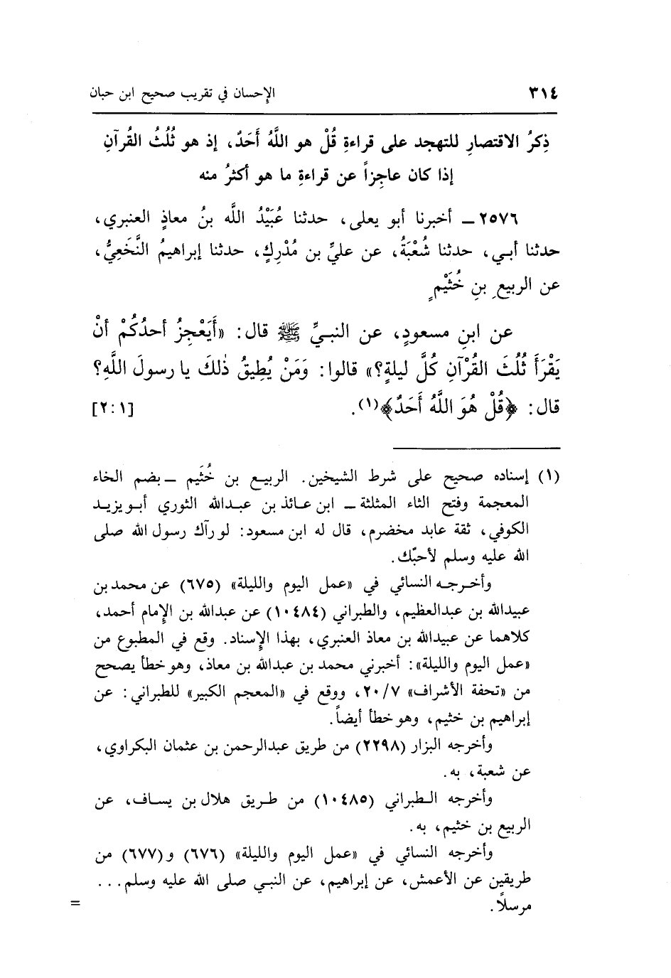 2576 - أَخْبَرَنَا أَبُو يَعْلَى، حَدَّثَنَا عُبَيْدُ اللَّهِ بْنُ مُعَاذٍ الْعَنْبَرِيُّ، حَدَّثَنَا أَبِي، حَدَّثَنَا شُعْبَةُ، عَنْ عَلِيِّ بْنِ مُدْرِكٍ، حَدَّثَنَا إِبْرَاهِيمُ النَّخَعِيُّ، عَنِ الرَّبِيعِ بْنِ خُثَيْمٍ، عَنِ ابْنِ مَسْعُودٍ، عَنِ النَّبِيِّ صَلَّى اللَّهُ عَلَيْهِ وَسَلَّمَ قَالَ: «أَيَعْجِزُ أَحَدُكُمْ أَنْ يَقْرَأَ ثُلُثَ الْقُرْآنِ كُلَّ لَيْلَةٍ؟» قَالُوا: وَمَنْ يُطِيقُ ذَلِكَ يَا رَسُولَ اللَّهِ؟ قَالَ: « {قُلْ هُوَ اللَّهُ أَحَدٌ} » (¬1) . [1: 2]