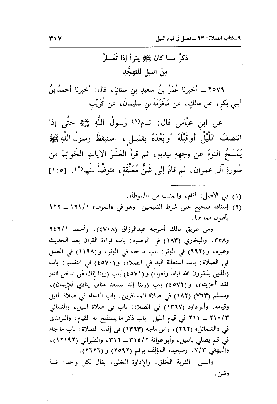 2579 - أَخْبَرَنَا عُمَرُ بْنُ سَعِيدِ بْنِ سِنَانٍ، قَالَ: أَخْبَرَنَا أَحْمَدُ بْنُ أَبِي بَكْرٍ، عَنْ مَالِكٍ، عَنْ مَخْرَمَةَ بْنِ سُلَيْمَانَ، عَنْ كُرَيْبٍ، عَنِ ابْنِ عَبَّاسٍ، قَالَ: «نَامَ (¬1) رَسُولُ اللَّهِ صَلَّى اللَّهُ عَلَيْهِ وَسَلَّمَ حَتَّى إِذَا انْتَصَفَ اللَّيْلُ، أَوْ قَبْلَهُ، أَوْ بَعْدَهُ بِقَلِيلٍ، اسْتَيْقَظَ رَسُولُ اللَّهِ صَلَّى اللَّهُ عَلَيْهِ وَسَلَّمَ يَمْسَحُ النَّوْمَ عَنْ وَجْهِهِ بِيَدَيْهِ، ثُمَّ قَرَأَ الْعَشْرَ الْآيَاتِ الْخَوَاتِمَ مِنْ سُورَةِ آلِ عِمْرَانَ، ثُمَّ قَامَ إِلَى شَنٍّ مُعَلَّقَةٍ، فَتَوَضَّأَ مِنْهَا» (¬2) . [5: 1]