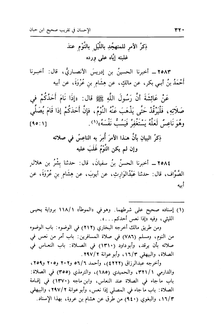 2583 - أَخْبَرَنَا الْحُسَيْنُ بْنُ إِدْرِيسَ الْأَنْصَارِيُّ، قَالَ: أَخْبَرَنَا أَحْمَدُ بْنُ أَبِي بَكْرٍ، عَنْ مَالِكٍ، عَنْ هِشَامِ بْنِ عُرْوَةَ، عَنْ أَبِيهِ، عَنْ عَائِشَةَ، أَنَّ رَسُولَ اللَّهِ صَلَّى اللَّهُ عَلَيْهِ وَسَلَّمَ قَالَ: «إِذَا نَامَ أَحَدُكُمْ فِي صَلَاتِهِ، فَلْيَرْقُدْ حَتَّى يَذْهَبَ عَنْهُ النَّوْمُ، فَإِنَّ أَحَدَكُمْ إِذَا قَامَ يُصَلِّي وَهُوَ نَاعِسٌ لَعَلَّهُ يَسْتَغْفِرُ فَيَسُبُّ نَفْسَهُ» (¬1) . [1: 95]