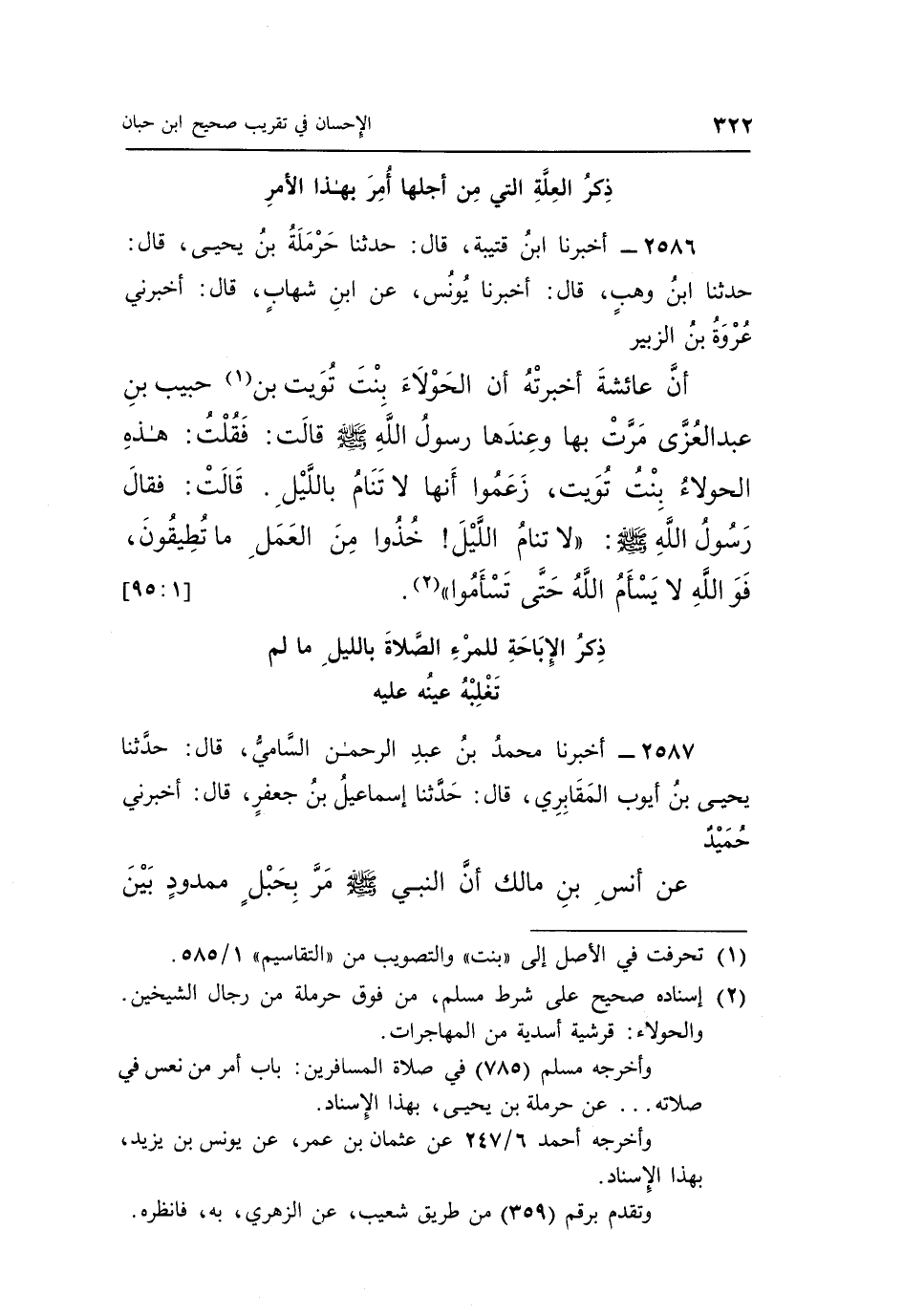 2586 - أَخْبَرَنَا ابْنُ قُتَيْبَةَ، قَالَ: حَدَّثَنَا حَرْمَلَةُ بْنُ يَحْيَى، قَالَ: حَدَّثَنَا ابْنُ وَهْبٍ، قَالَ: أَخْبَرَنَا يُونُسُ، عَنِ ابْنِ شِهَابٍ، قَالَ: أَخْبَرَنِي عُرْوَةُ بْنُ الزُّبَيْرِ، أَنَّ عَائِشَةَ أَخْبَرَتْهُ، أَنَّ الْحَوْلَاءَ بِنْتَ تُوَيْتِ بْنِ (¬1) حَبِيبِ بْنِ عَبْدِ الْعُزَّى مَرَّتْ بِهَا، وَعِنْدَهَا رَسُولُ اللَّهِ صَلَّى اللَّهُ عَلَيْهِ وَسَلَّمَ، قَالَتْ: فَقُلْتُ: هَذِهِ الْحَوْلَاءُ بِنْتُ تُوَيْتٍ، زَعَمُوا أَنَّهَا لَا تَنَامُ بِاللَّيْلِ، قَالَتْ: فَقَالَ رَسُولُ اللَّهِ صَلَّى اللَّهُ عَلَيْهِ وَسَلَّمَ: «لَا تَنَامُ اللَّيْلَ خُذُوا مِنَ الْعَمَلِ مَا تُطِيقُونَ، فَوَاللَّهِ لَا يَسْأَمُ اللَّهُ حَتَّى تَسْأَمُوا» (¬2) . [1: 95]