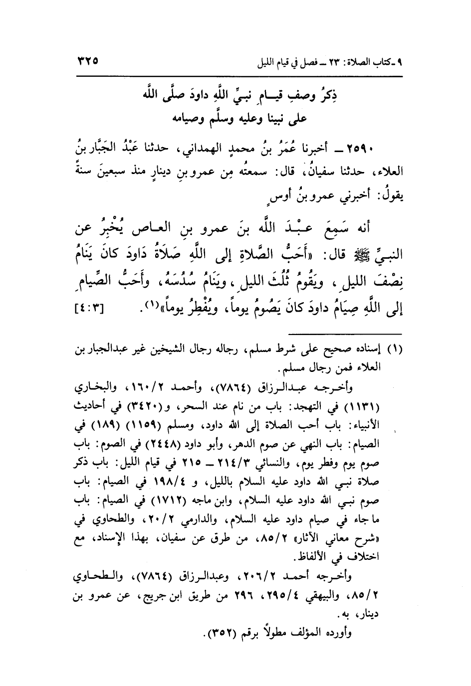 2590 - أَخْبَرَنَا عُمَرُ بْنُ مُحَمَّدٍ الْهَمْدَانِيُّ، حَدَّثَنَا عَبْدُ الْجَبَّارِ بْنُ الْعَلَاءِ، حَدَّثَنَا سُفْيَانُ، قَالَ: سَمِعْتُهُ مِنْ عَمْرِو بْنِ دِينَارٍ مُنْذُ سَبْعِينَ سَنَةً، يَقُولُ: أَخْبَرَنِي عَمْرُو بْنُ أَوْسٍ، أَنَّهُ سَمِعَ عَبْدَ اللَّهِ بْنَ عَمْرِو بْنِ الْعَاصِ يُخْبِرُ، عَنِ النَّبِيِّ صَلَّى اللَّهُ عَلَيْهِ وَسَلَّمَ، قَالَ: «أَحَبُّ الصَّلَاةِ إِلَى اللَّهِ صَلَاةُ دَاوُدَ، كَانَ يَنَامُ نِصْفَ اللَّيْلِ، وَيَقُومُ ثُلُثَ اللَّيْلِ، وَيَنَامُ سُدُسَهُ، وَأَحَبُّ الصِّيَامِ إِلَى اللَّهِ صِيَامُ دَاوُدَ، كَانَ يَصُومُ يَوْمًا، وَيُفْطِرُ يَوْمًا» (¬1) . [3: 4]