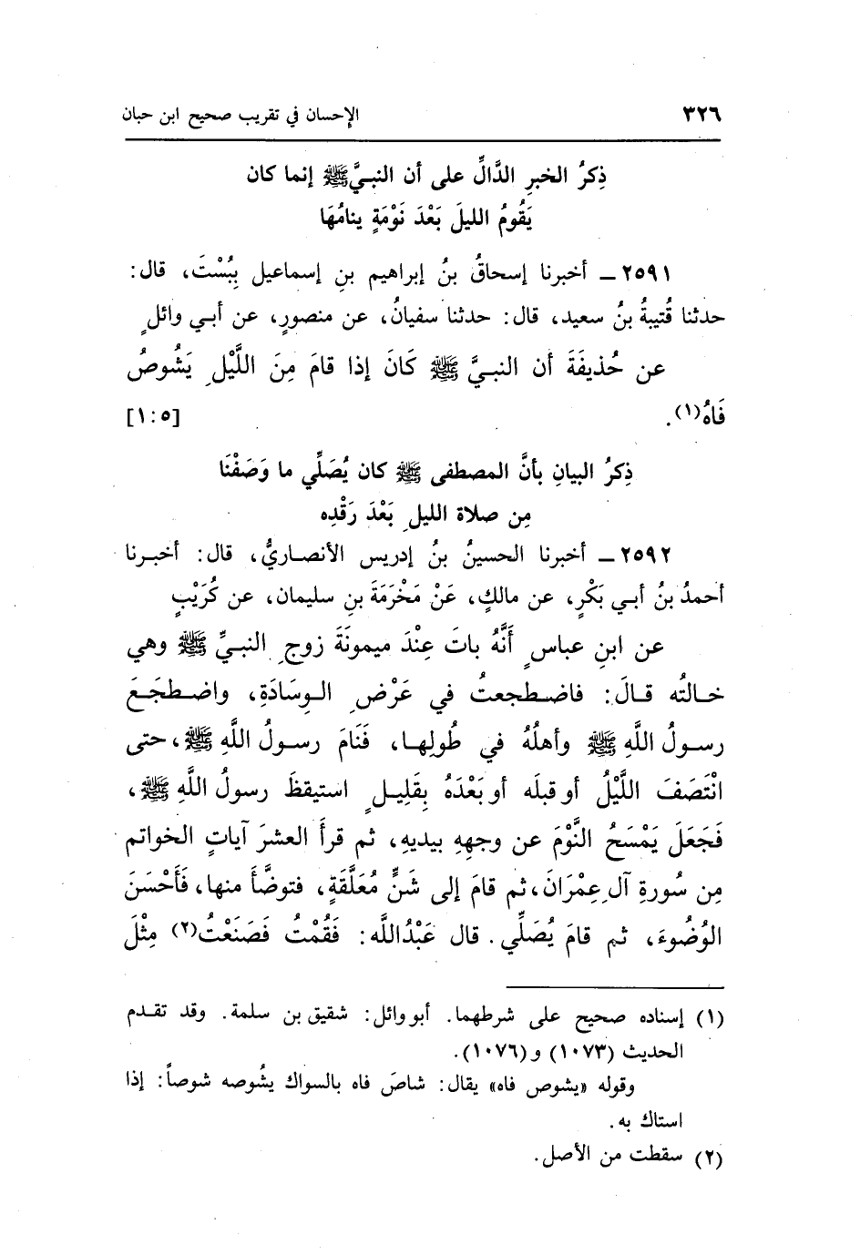 2592 - أَخْبَرَنَا الْحُسَيْنُ بْنُ إِدْرِيسَ الْأَنْصَارِيُّ، قَالَ: أَخْبَرَنَا أَحْمَدُ بْنُ أَبِي بَكْرٍ، عَنْ مَالِكٍ، عَنْ مَخْرَمَةَ بْنِ سُلَيْمَانَ، عَنْ كُرَيْبٍ، عَنِ ابْنِ عَبَّاسٍ، أَنَّهُ بَاتَ عِنْدَ مَيْمُونَةَ زَوْجِ النَّبِيِّ صَلَّى اللَّهُ عَلَيْهِ وَسَلَّمَ، وَهِيَ خَالَتُهُ، قَالَ: فَاضْطَجَعْتُ فِي عَرْضِ الْوِسَادَةِ، «وَاضْطَجَعَ رَسُولُ اللَّهِ صَلَّى اللَّهُ عَلَيْهِ وَسَلَّمَ وَأَهْلُهُ فِي طُولِهَا، فَنَامَ رَسُولُ اللَّهِ صَلَّى اللَّهُ عَلَيْهِ وَسَلَّمَ حَتَّى انْتَصَفَ اللَّيْلُ، أَوْ قَبْلَهُ، أَوْ بَعْدَهُ بِقَلِيلٍ، اسْتَيْقَظَ رَسُولُ اللَّهِ صَلَّى اللَّهُ عَلَيْهِ وَسَلَّمَ، فَجَعَلَ يَمْسَحُ النَّوْمَ عَنْ وَجْهِهِ بِيَدَيْهِ، ثُمَّ قَرَأَ الْعَشْرَ آيَاتِ الْخَوَاتِمَ مِنْ سُورَةِ آلِ عِمْرَانَ، ثُمَّ قَامَ إِلَى شَنٍّ مُعَلَّقَةٍ، فَتَوَضَّأَ مِنْهَا فَأَحْسَنَ الْوُضُوءَ، ثُمَّ قَامَ يُصَلِّي» ، قَالَ عَبْدُ اللَّهِ: فَقُمْتُ فَصَنَعْتُ (¬2) مِثْلَ