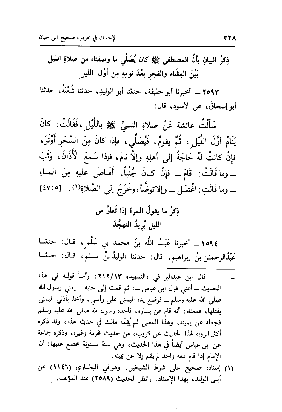 2593 - أَخْبَرَنَا أَبُو خَلِيفَةَ، حَدَّثَنَا أَبُو الْوَلِيدِ، حَدَّثَنَا شُعْبَةُ، حَدَّثَنَا أَبُو إِسْحَاقَ، عَنِ الْأَسْوَدِ، قَالَ: سَأَلْتُ عَائِشَةَ عَنْ صَلَاةِ النَّبِيِّ صَلَّى اللَّهُ عَلَيْهِ وَسَلَّمَ بِاللَّيْلِ، فَقَالَتْ: «كَانَ يَنَامُ أَوَّلَ اللَّيْلِ، ثُمَّ يَقُومُ فَيُصَلِّي، فَإِذَا كَانَ مِنَ السَّحَرِ أَوْتَرَ، فَإِنْ كَانَتْ لَهُ حَاجَةٌ إِلَى أَهْلِهِ وَإِلَّا نَامَ، فَإِذَا سَمِعَ الْأَذَانَ وَثَبَ - وَمَا قَالَتْ: قَامَ - فَإِنْ كَانَ جُنُبًا أَفَاضَ عَلَيْهِ مِنَ الْمَاءِ - وَمَا قَالَتِ: اغْتَسَلَ - وَإِلَّا تَوَضَّأَ، وَخَرَجَ إِلَى الصَّلَاةِ» (¬1) . [5: 47]