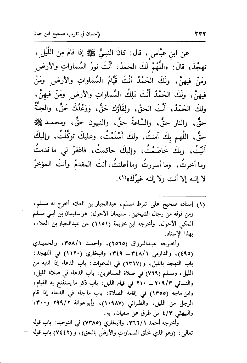 عَنِ ابْنِ عَبَّاسٍ، قَالَ: كَانَ النَّبِيُّ صَلَّى اللَّهُ عَلَيْهِ وَسَلَّمَ إِذَا قَامَ مِنَ اللَّيْلِ تَهَجَّدَ، قَالَ: «اللَّهُمَّ لَكَ الْحَمْدُ، أَنْتَ نُورُ السَّمَاوَاتِ وَالْأَرْضِ وَمَنْ فِيهِنَّ، وَلَكَ الْحَمْدُ أَنْتَ قَيَّامُ السَّمَاوَاتِ وَالْأَرْضِ وَمَنْ فِيهِنَّ، وَلَكَ الْحَمْدُ أَنْتَ مَلِكُ السَّمَاوَاتِ وَالْأَرْضِ وَمَنْ فِيهِنَّ، وَلَكَ الْحَمْدُ أَنْتَ الْحَقُّ، وَلِقَاؤُكَ حَقٌّ، وَوَعْدُكَ حَقٌّ، وَالْجَنَّةُ حَقٌّ، وَالنَّارُ حَقٌّ، وَالسَّاعَةُ حَقٌّ، وَالنَّبِيُّونَ حَقٌّ، وَمُحَمَّدٌ صَلَّى اللَّهُ عَلَيْهِ وَسَلَّمَ حَقٌّ، اللَّهُمَّ بِكَ آمَنْتُ، وَلَكَ أَسْلَمْتُ، وَعَلَيْكَ تَوَكَّلْتُ، وَإِلَيْكَ أَنَبْتُ، وَبِكَ خَاصَمْتُ، وَإِلَيْكَ حَاكَمْتُ، فَاغْفِرْ لِي مَا قَدَّمْتُ وَمَا أَخَّرْتُ، وَمَا أَسْرَرْتُ وَمَا أَعْلَنْتُ، أَنْتَ الْمُقَدِّمُ، وَأَنْتَ الْمُؤَخِّرُ، لَا إِلَهَ إِلَّا أَنْتَ، وَلَا إِلَهَ غَيْرُكَ» (¬1) .