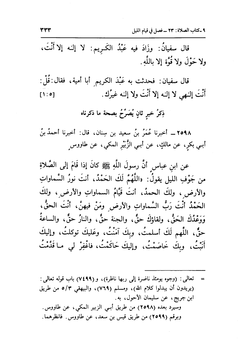 2598 - أَخْبَرَنَا عُمَرُ بْنُ سَعِيدِ بْنِ سِنَانٍ، قَالَ: أَخْبَرَنَا أَحْمَدُ بْنُ أَبِي بَكْرٍ، عَنْ مَالِكٍ، عَنْ أَبِي الزُّبَيْرِ الْمَكِّيِّ، عَنْ طَاوُوسٍ، عَنِ ابْنِ عَبَّاسٍ، أَنَّ رَسُولَ اللَّهِ صَلَّى اللَّهُ عَلَيْهِ وَسَلَّمَ كَانَ إِذَا قَامَ إِلَى الصَّلَاةِ مِنْ جَوْفِ اللَّيْلِ يَقُولُ: «اللَّهُمَّ لَكَ الْحَمْدُ، أَنْتَ نُورُ السَّمَاوَاتِ وَالْأَرْضِ، وَلَكَ الْحَمْدُ، أَنْتَ قَيَّامُ السَّمَاوَاتِ وَالْأَرْضِ، وَلَكَ الْحَمْدُ أَنْتَ رَبُّ السَّمَاوَاتِ وَالْأَرْضِ وَمَنْ فِيهِنَّ، أَنْتَ الْحَقُّ، وَوَعْدُكَ الْحَقُّ، وَلِقَاؤُكَ حَقٌّ، وَالْجَنَّةُ حَقٌّ، وَالنَّارُ حَقٌّ، وَالسَّاعَةُ حَقٌّ، اللَّهُمَّ لَكَ أَسْلَمْتُ، وَبِكَ آمَنْتُ، وَعَلَيْكَ تَوَكَّلْتُ، وَإِلَيْكَ أَنَبْتُ، وَبِكَ خَاصَمْتُ، وَإِلَيْكَ حَاكَمْتُ، فَاغْفِرْ لِي مَا قَدَّمْتُ
