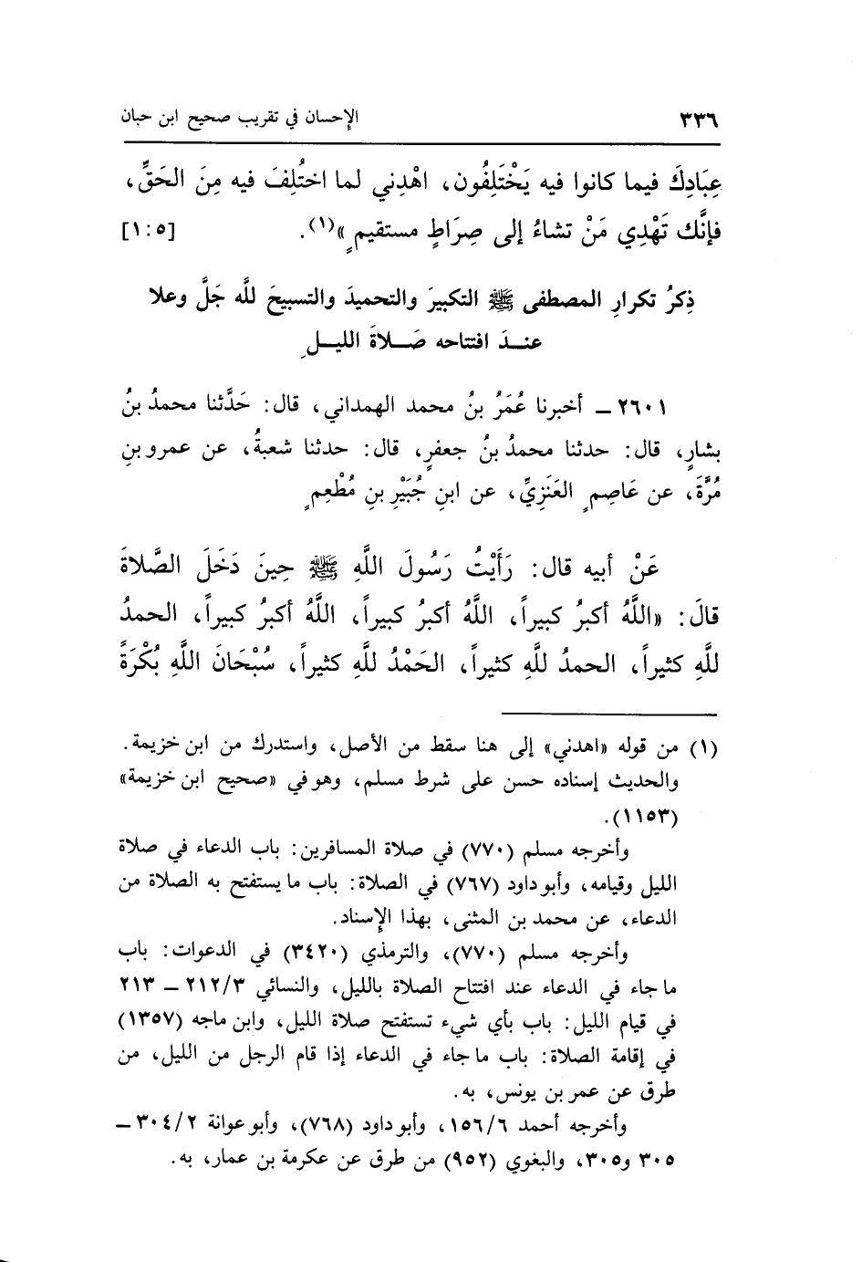 2601 - أَخْبَرَنَا عُمَرُ بْنُ مُحَمَّدٍ الْهَمْدَانِيُّ، قَالَ: حَدَّثَنَا مُحَمَّدُ بْنُ بَشَّارٍ، قَالَ: حَدَّثَنَا مُحَمَّدُ بْنُ جَعْفَرٍ، قَالَ: حَدَّثَنَا شُعْبَةُ، عَنْ عَمْرِو بْنِ مُرَّةَ، عَنْ عَاصِمٍ الْعَنَزِيِّ، عَنِ ابْنِ جُبَيْرِ بْنِ مُطْعِمٍ، عَنْ أَبِيهِ، قَالَ: رَأَيْتُ رَسُولَ اللَّهِ صَلَّى اللَّهُ عَلَيْهِ وَسَلَّمَ حِينَ دَخَلَ الصَّلَاةَ، قَالَ: «اللَّهُ أَكْبَرُ كَبِيرًا، اللَّهُ أَكْبَرُ كَبِيرًا، اللَّهُ أَكْبَرُ كَبِيرًا، الْحَمْدُ لِلَّهِ كَثِيرًا، الْحَمْدُ لِلَّهِ كَثِيرًا، الْحَمْدُ لِلَّهِ كَثِيرًا، سُبْحَانَ اللَّهِ بُكْرَةً