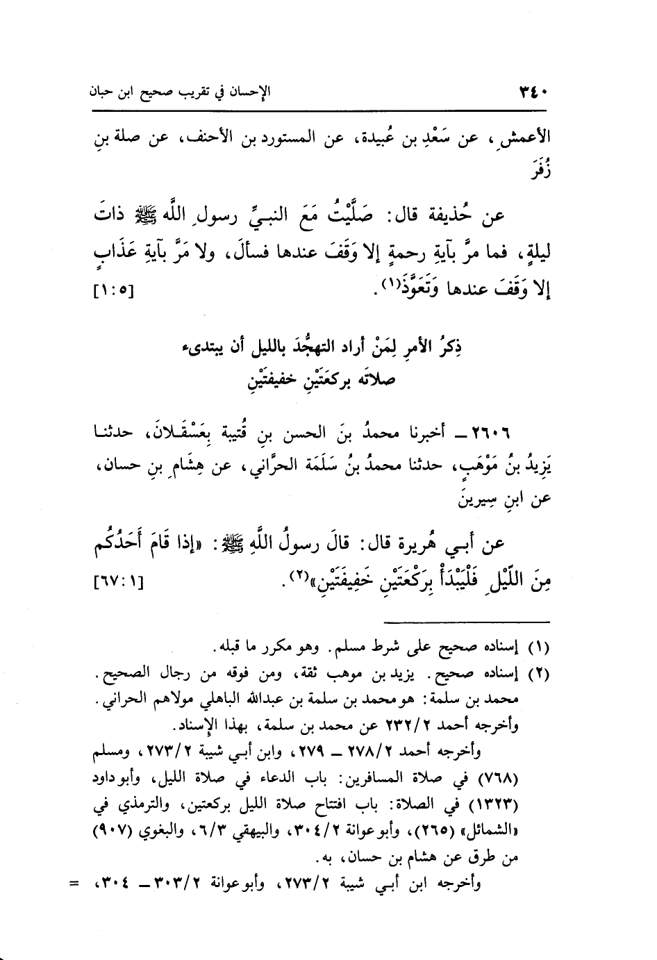 الْأَعْمَشِ، عَنْ سَعْدِ بْنِ عُبَيْدَةَ، عَنِ الْمُسْتَوْرِدِ بْنِ الْأَحْنَفِ، عَنْ صِلَةَ بْنِ زُفَرَ، عَنْ حُذَيْفَةَ، قَالَ: «صَلَّيْتُ مَعَ النَّبِيِّ رَسُولِ اللَّهِ صَلَّى اللَّهُ عَلَيْهِ وَسَلَّمَ ذَاتَ لَيْلَةٍ، فَمَا مَرَّ بِآيَةِ رَحْمَةٍ إِلَّا وَقَفَ عِنْدَهَا فَسَأَلَ، وَلَا مَرَّ بِآيَةِ عَذَابٍ إِلَّا وَقَفَ عِنْدَهَا وَتَعَوَّذَ» (¬1) . [5: 1]