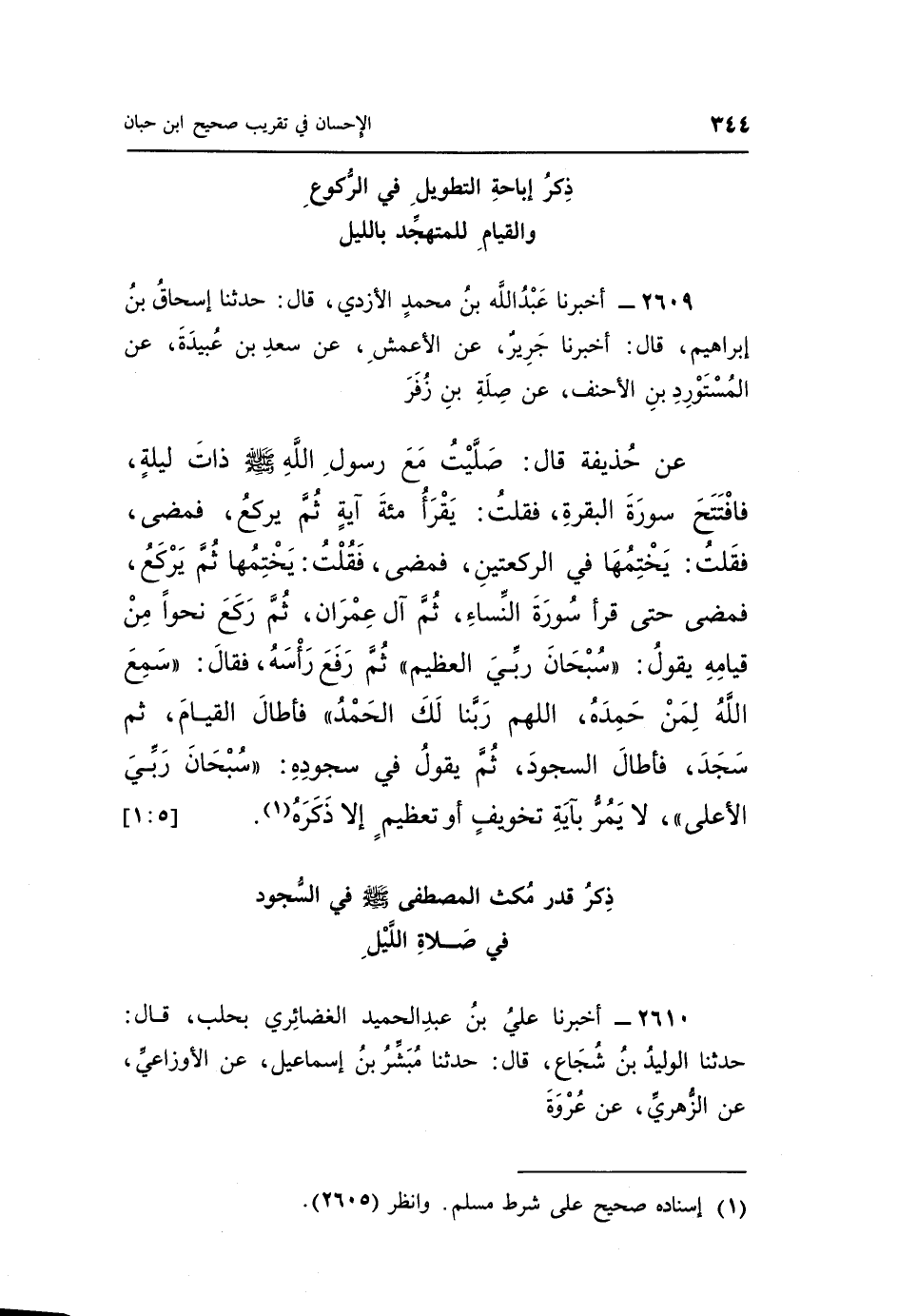 2609 - أَخْبَرَنَا عَبْدُ اللَّهِ بْنُ مُحَمَّدٍ الْأَزْدِيُّ، قَالَ: حَدَّثَنَا إِسْحَاقُ بْنُ إِبْرَاهِيمَ، قَالَ: أَخْبَرَنَا جَرِيرٌ، عَنِ الْأَعْمَشِ، عَنْ سَعْدِ بْنِ عُبَيْدَةَ، عَنِ الْمُسْتَوْرِدِ بْنِ الْأَحْنَفِ، عَنْ صِلَةَ بْنِ زُفَرَ، عَنْ حُذَيْفَةَ، قَالَ: «صَلَّيْتُ مَعَ رَسُولِ اللَّهِ صَلَّى اللَّهُ عَلَيْهِ وَسَلَّمَ ذَاتَ لَيْلَةٍ، فَافْتَتَحَ سُورَةَ الْبَقَرَةِ فَقُلْتُ: يَقْرَأُ مِائَةَ آيَةٍ ثُمَّ يَرْكَعُ، فَمَضَى، فَقُلْتُ: يَخْتِمُهَا فِي الرَّكْعَتَيْنِ، فَمَضَى، فَقُلْتُ: يَخْتِمُهَا ثُمَّ يَرْكَعُ، فَمَضَى حَتَّى قَرَأَ سُورَةَ النِّسَاءِ، ثُمَّ آلِ عِمْرَانَ، ثُمَّ رَكَعَ نَحْوًا مِنْ قِيَامِهِ، يَقُولُ: سُبْحَانَ رَبِّيَ الْعَظِيمِ، ثُمَّ رَفَعَ رَأْسَهُ، فَقَالَ: سَمِعَ اللَّهُ لِمَنْ حَمِدَهُ، اللَّهُمَّ رَبَّنَا لَكَ الْحَمْدُ، فَأَطَالَ الْقِيَامَ، ثُمَّ سَجَدَ فَأَطَالَ السُّجُودَ، ثُمَّ يَقُولُ فِي سُجُودِهِ: سُبْحَانَ رَبِّيَ الْأَعْلَى، لَا يَمُرُّ بِآيَةِ تَخْوِيفٍ أَوْ تَعْظِيمٍ إِلَّا ذَكَرَهُ» (¬1) . [5: 1]