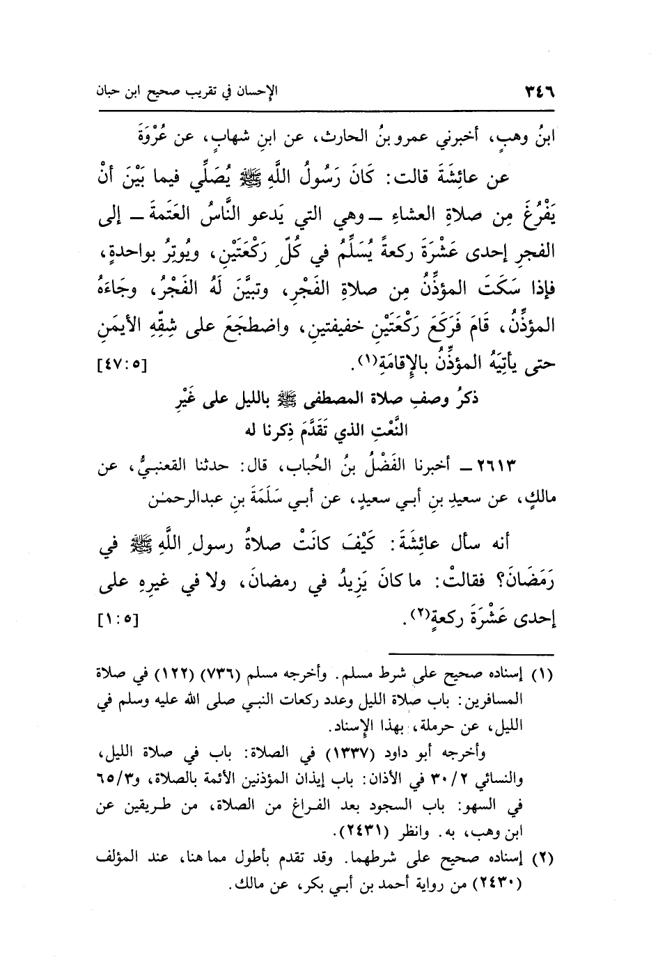 ابْنُ وَهْبٍ، أَخْبَرَنِي عَمْرُو بْنُ الْحَارِثِ، عَنِ ابْنِ شِهَابٍ، عَنْ عُرْوَةَ، عَنْ عَائِشَةَ، قَالَتْ: «كَانَ رَسُولُ اللَّهِ صَلَّى اللَّهُ عَلَيْهِ وَسَلَّمَ يُصَلِّي فِيمَا بَيْنَ أَنْ يَفْرُغَ مِنْ صَلَاةِ الْعِشَاءِ، وَهِيَ الَّتِي يَدْعُو النَّاسُ الْعَتَمَةَ إِلَى الْفَجْرِ إِحْدَى عَشْرَةَ رَكْعَةً، يُسَلِّمُ فِي كُلِّ رَكْعَتَيْنِ، وَيُوتِرُ بِوَاحِدَةٍ، فَإِذَا سَكَتَ الْمُؤَذِّنُ مِنْ صَلَاةِ الْفَجْرِ، وَتَبَيَّنَ لَهُ الْفَجْرُ، وَجَاءَهُ الْمُؤَذِّنُ، قَامَ فَرَكَعَ رَكْعَتَيْنِ خَفِيفَتَيْنِ، وَاضْطَجَعَ عَلَى شِقِّهِ الْأَيْمَنِ حَتَّى يَأْتِيَهُ الْمُؤَذِّنُ بِالْإِقَامَةِ» (¬1) . [5: 47]