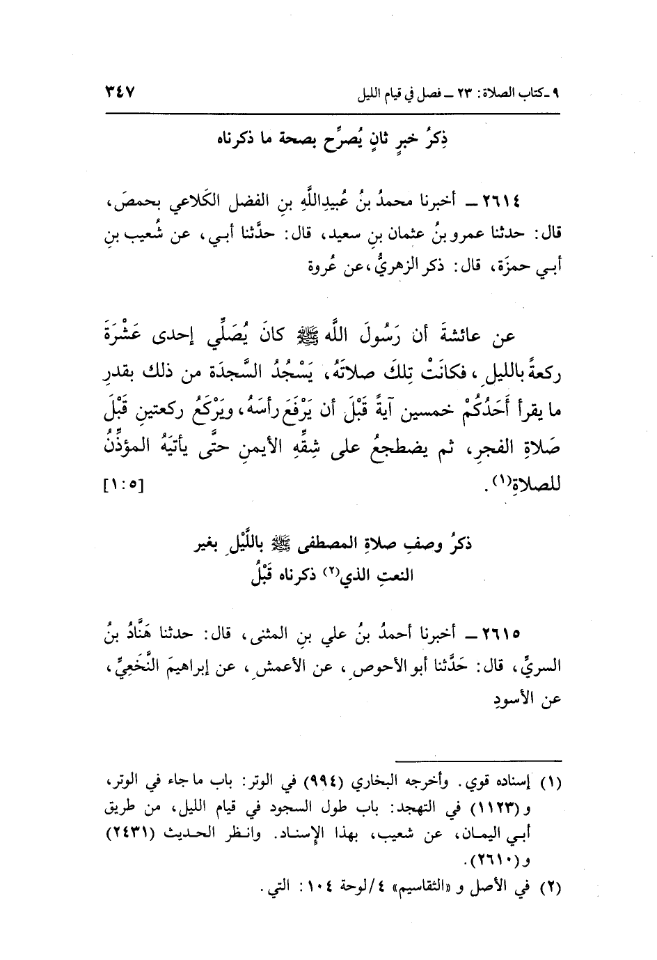 2614 - أَخْبَرَنَا مُحَمَّدُ بْنُ عُبَيْدِ اللَّهِ بْنِ الْفَضْلِ الْكَلَاعِيُّ بِحِمْصَ، قَالَ: حَدَّثَنَا عَمْرُو بْنُ عُثْمَانَ بْنِ سَعِيدٍ، قَالَ: حَدَّثَنَا أَبِي، عَنْ شُعَيْبِ بْنِ أَبِي حَمْزَةَ، قَالَ: ذَكَرَ الزُّهْرِيُّ، عَنْ عُرْوَةَ، عَنْ عَائِشَةَ، «أَنَّ رَسُولَ اللَّهِ صَلَّى اللَّهُ عَلَيْهِ وَسَلَّمَ كَانَ يُصَلِّي إِحْدَى عَشْرَةَ رَكْعَةً بِاللَّيْلِ، فَكَانَتْ تِلْكَ صَلَاتُهُ، يَسْجُدُ السَّجْدَةَ مِنْ ذَلِكَ بِقَدْرِ مَا يَقْرَأُ أَحَدُكُمْ خَمْسِينَ آيَةً قَبْلَ أَنْ يَرْفَعَ رَأْسَهُ، وَيَرْكَعُ رَكْعَتَيْنِ قَبْلَ صَلَاةِ الْفَجْرِ، ثُمَّ يَضْطَجِعُ عَلَى شِقِّهِ الْأَيْمَنِ حَتَّى يَأْتِيَهُ الْمُؤَذِّنُ لِلصَّلَاةِ» (¬1) . [5: 1]