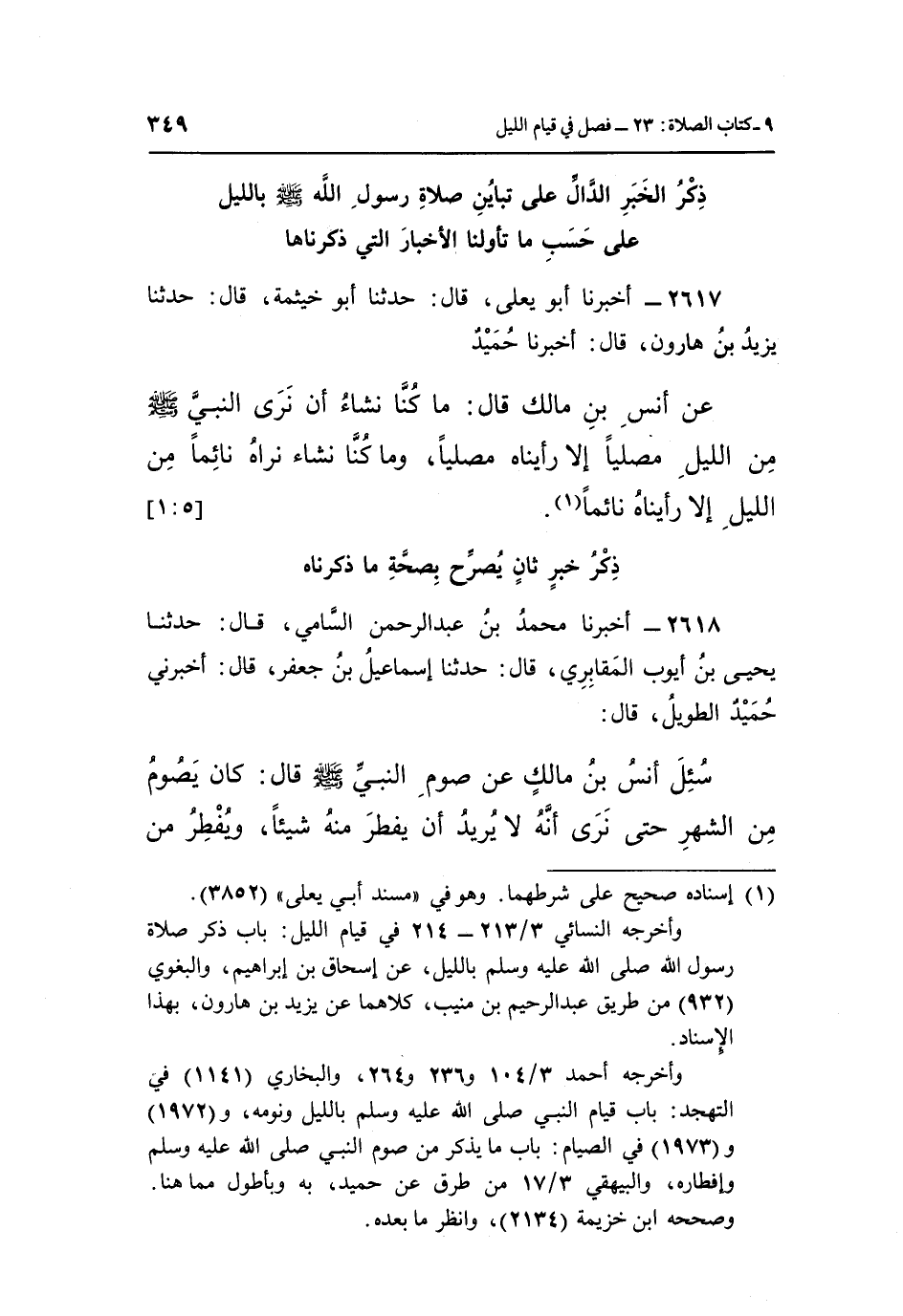 2617 - أَخْبَرَنَا أَبُو يَعْلَى، قَالَ: حَدَّثَنَا أَبُو خَيْثَمَةَ، قَالَ: حَدَّثَنَا يَزِيدُ بْنُ هَارُونَ، قَالَ: أَخْبَرَنَا حُمَيْدٌ، عَنْ أَنَسِ بْنِ مَالِكٍ، قَالَ: «مَا كُنَّا نَشَاءُ أَنْ نَرَى النَّبِيَّ صَلَّى اللَّهُ عَلَيْهِ وَسَلَّمَ مِنَ اللَّيْلِ مُصَلِّيًا إِلَّا رَأَيْنَاهُ مُصَلِّيًا، وَمَا كُنَّا نَشَاءُ نَرَاهُ نَائِمًا مِنَ اللَّيْلِ إِلَّا رَأَيْنَاهُ نَائِمًا» (¬1) . [5: 1]