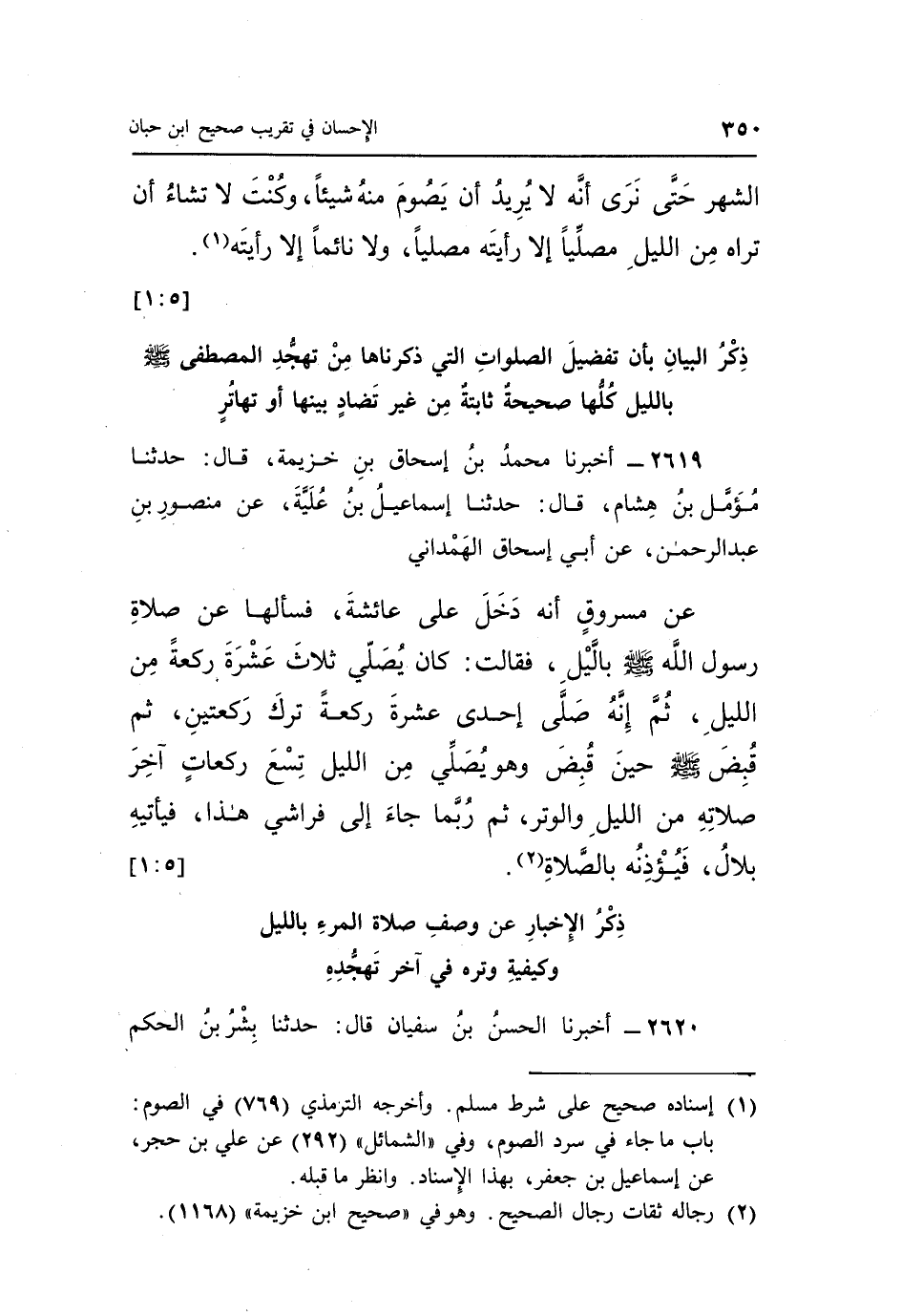 2619 - أَخْبَرَنَا مُحَمَّدُ بْنُ إِسْحَاقَ بْنِ خُزَيْمَةَ، قَالَ: حَدَّثَنَا مُؤَمَّلُ بْنُ هِشَامٍ، قَالَ: حَدَّثَنَا إِسْمَاعِيلُ بْنُ عُلَيَّةَ، عَنْ مَنْصُورِ بْنِ عَبْدِ الرَّحْمَنِ، عَنْ أَبِي إِسْحَاقَ الْهَمْدَانِيِّ، عَنْ مَسْرُوقٍ، أَنَّهُ دَخَلَ عَلَى عَائِشَةَ فَسَأَلَهَا عَنْ صَلَاةِ رَسُولِ اللَّهِ صَلَّى اللَّهُ عَلَيْهِ وَسَلَّمَ بِاللَّيْلِ، فَقَالَتْ: «كَانَ يُصَلِّي ثَلَاثَ عَشْرَةَ رَكْعَةً مِنَ اللَّيْلِ، ثُمَّ إِنَّهُ صَلَّى إِحْدَى عَشْرَةَ رَكْعَةً تَرَكَ رَكْعَتَيْنِ، ثُمَّ قُبِضَ صَلَّى اللَّهُ عَلَيْهِ وَسَلَّمَ حِينَ قُبِضَ وَهُوَ يُصَلِّي مِنَ اللَّيْلِ تِسْعَ رَكَعَاتٍ آخِرَ صَلَاتِهِ مِنَ اللَّيْلِ وَالْوِتْرِ، ثُمَّ رُبَّمَا جَاءَ إِلَى فِرَاشِي هَذَا، فَيَأْتِيهِ بِلَالٌ فَيُؤْذِنُهُ بِالصَّلَاةِ» (¬2) . [5: 1]