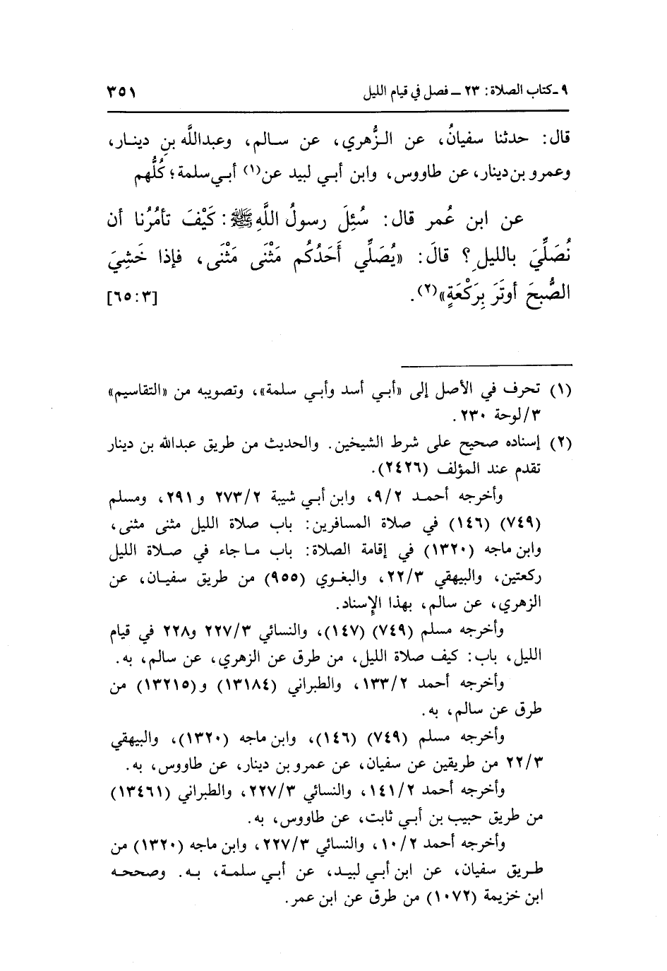 قَالَ: حَدَّثَنَا سُفْيَانُ، عَنِ الزُّهْرِيِّ، عَنْ سَالِمٍ، وَعَبْدِ اللَّهِ بْنِ دِينَارٍ، وَعَمْرِو بْنِ دِينَارٍ، عَنْ طَاوُوسٍ، وَابْنِ أَبِي لَبِيدٍ، عَنْ (¬1) أَبِي سَلَمَةَ، كُلُّهُمْ عَنِ ابْنِ عُمَرَ، قَالَ: سُئِلَ رَسُولُ اللَّهِ صَلَّى اللَّهُ عَلَيْهِ وَسَلَّمَ: كَيْفَ تَأْمُرُنَا أَنْ نُصَلِّيَ بِاللَّيْلِ؟ قَالَ: «يُصَلِّي أَحَدُكُمْ مَثْنَى مَثْنَى، فَإِذَا خَشِيَ الصُّبْحَ أَوْتَرَ بِرَكْعَةٍ» (¬2) . [3: 65]