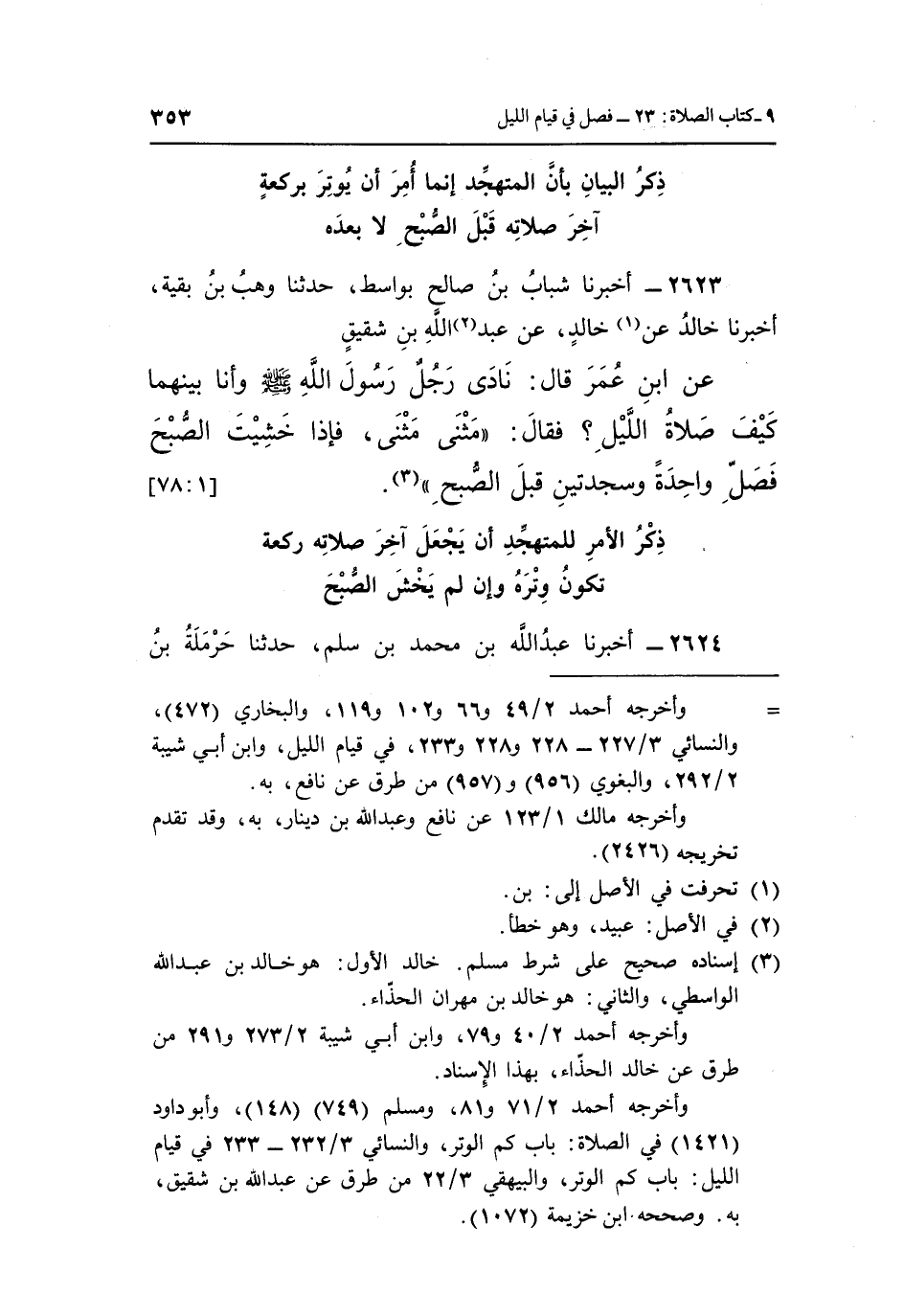 2623 - أَخْبَرَنَا شَبَابُ بْنُ صَالِحٍ بِوَاسِطَ، حَدَّثَنَا وَهْبُ بْنُ بَقِيَّةَ، أَخْبَرَنَا خَالِدٌ (¬1) ، عَنْ (¬2) خَالِدٍ، عَنْ عَبْدِ اللَّهِ بْنِ شَقِيقٍ، عَنِ ابْنِ عُمَرَ، قَالَ: نَادَى رَجُلٌ رَسُولَ اللَّهِ صَلَّى اللَّهُ عَلَيْهِ وَسَلَّمَ، وَأَنَا بَيْنَهُمَا، كَيْفَ صَلَاةُ اللَّيْلِ؟ فَقَالَ: «مَثْنَى مَثْنَى، فَإِذَا خَشِيتَ الصُّبْحَ فَصَلِّ وَاحِدَةً وَسَجْدَتَيْنِ قَبْلَ الصُّبْحِ» (¬3) . [1: 78]