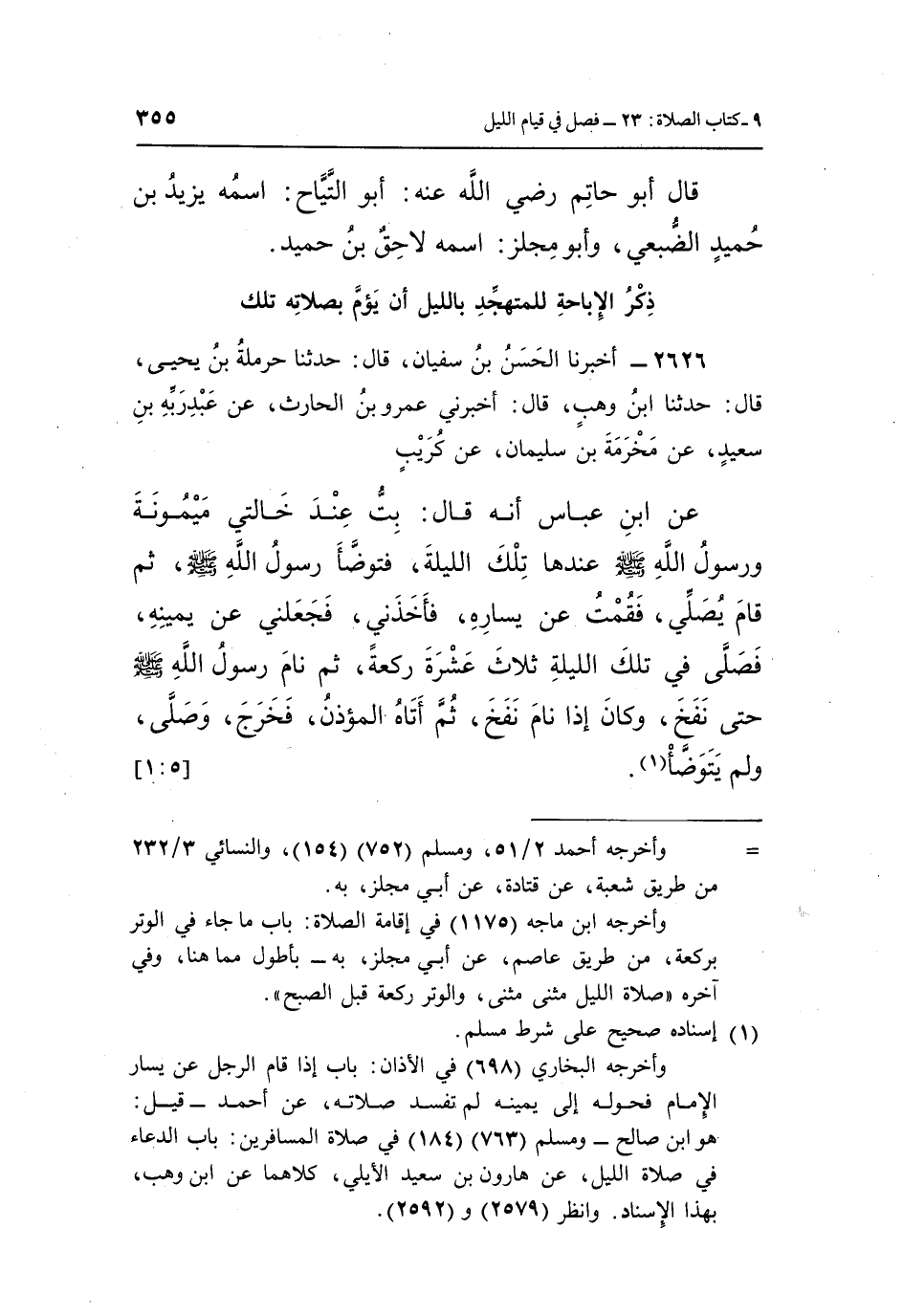2626 - أَخْبَرَنَا الْحَسَنُ بْنُ سُفْيَانَ، قَالَ: حَدَّثَنَا حَرْمَلَةُ بْنُ يَحْيَى، قَالَ: حَدَّثَنَا ابْنُ وَهْبٍ، قَالَ: أَخْبَرَنِي عَمْرُو بْنُ الْحَارِثِ، عَنْ عَبْدِ رَبِّهِ بْنِ سَعِيدٍ، عَنْ مَخْرَمَةَ بْنِ سُلَيْمَانَ، عَنْ كُرَيْبٍ، عَنِ ابْنِ عَبَّاسٍ، أَنَّهُ قَالَ: بِتُّ عِنْدَ خَالَتِي مَيْمُونَةَ، وَرَسُولُ اللَّهِ صَلَّى اللَّهُ عَلَيْهِ وَسَلَّمَ عِنْدَهَا تِلْكَ اللَّيْلَةَ، «فَتَوَضَّأَ رَسُولُ اللَّهِ صَلَّى اللَّهُ عَلَيْهِ وَسَلَّمَ، ثُمَّ قَامَ يُصَلِّي، فَقُمْتُ عَنْ يَسَارِهِ، فَأَخَذَنِي فَجَعَلَنِي عَنْ يَمِينِهِ، فَصَلَّى فِي تِلْكَ اللَّيْلَةِ ثَلَاثَ عَشْرَةَ رَكْعَةً، ثُمَّ نَامَ رَسُولُ اللَّهِ صَلَّى اللَّهُ عَلَيْهِ وَسَلَّمَ حَتَّى نَفَخَ، وَكَانَ إِذَا نَامَ نَفَخَ، ثُمَّ أَتَاهُ الْمُؤَذِّنُ، فَخَرَجَ، وَصَلَّى وَلَمْ يَتَوَضَّأْ» (¬1) . [5: 1]