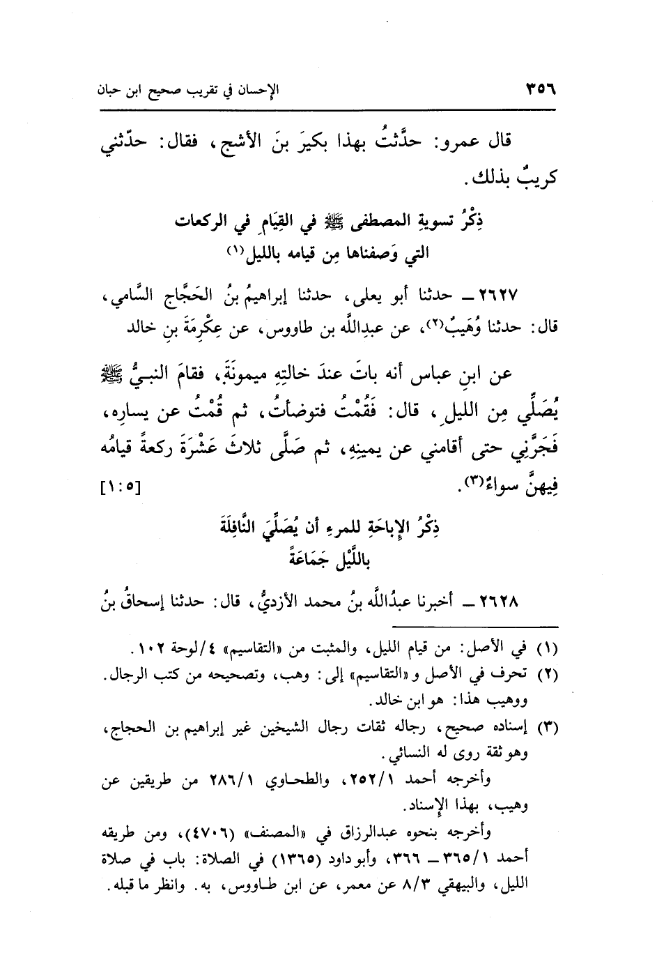2627 - حَدَّثَنَا أَبُو يَعْلَى، حَدَّثَنَا إِبْرَاهِيمُ بْنُ الْحَجَّاجِ السَّامِيُّ، قَالَ: حَدَّثَنَا وُهَيْبٌ (¬2) ، عَنْ عَبْدِ اللَّهِ بْنِ طَاوُوسٍ، عَنْ عِكْرِمَةَ بْنِ خَالِدٍ، عَنِ ابْنِ عَبَّاسٍ، أَنَّهُ بَاتَ عِنْدَ خَالَتِهِ مَيْمُونَةَ، «فَقَامَ النَّبِيُّ صَلَّى اللَّهُ عَلَيْهِ وَسَلَّمَ يُصَلِّي مِنَ اللَّيْلِ» ، قَالَ: «فَقُمْتُ فَتَوَضَّأْتُ، ثُمَّ قُمْتُ عَنْ يَسَارِهِ، فَجَرَّنِي حَتَّى أَقَامَنِي عَنْ يَمِينِهِ، ثُمَّ صَلَّى ثَلَاثَ عَشْرَةَ رَكْعَةً، قِيَامُهُ فِيهِنَّ سَوَاءٌ» (¬3) . [5: 1]