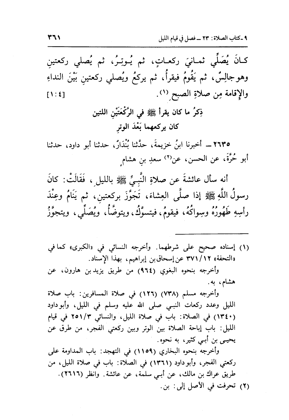 2635 - أَخْبَرَنَا ابْنُ خُزَيْمَةَ، حَدَّثَنَا بُنْدَارٌ، حَدَّثَنَا أَبُو دَاوُدَ، حَدَّثَنَا أَبُو حُرَّةَ، عَنِ الْحَسَنِ، عَنْ (¬2) سَعْدِ بْنِ هِشَامٍ، أَنَّهُ سَأَلَ عَائِشَةَ عَنْ صَلَاةِ النَّبِيِّ صَلَّى اللَّهُ عَلَيْهِ وَسَلَّمَ بِاللَّيْلِ، فَقَالَتْ: «كَانَ رَسُولُ اللَّهِ صَلَّى اللَّهُ عَلَيْهِ وَسَلَّمَ إِذَا صَلَّى الْعِشَاءَ تَجَوَّزَ بِرَكْعَتَيْنِ، ثُمَّ يَنَامُ وَعِنْدَ رَأْسِهِ طَهُورُهُ وَسِوَاكُهُ، فَيَقُومُ فَيَتَسَوَّكُ وَيَتَوَضَّأُ وَيُصَلِّي، وَيَتَجَوَّزُ