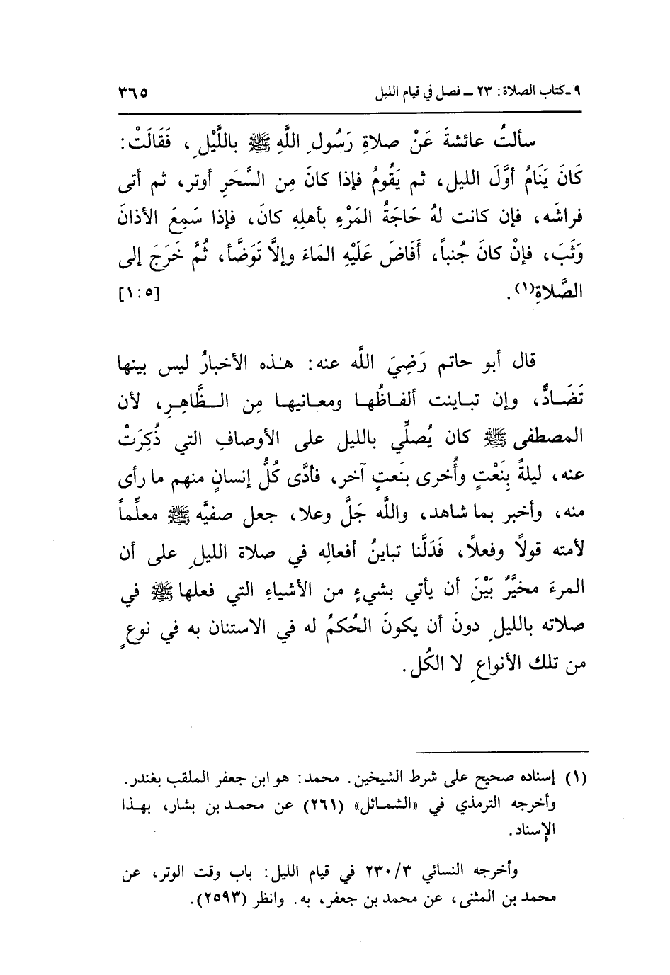 قَالَ: أَبُو حَاتِمٍ رَضِيَ اللَّهُ عَنْهُ: «هَذِهِ الْأَخْبَارُ لَيْسَ بَيْنَهَا تَضَادٌّ، وَإِنْ تَبَايَنَتْ أَلْفَاظُهَا وَمَعَانِيهَا مِنَ الظَّاهِرِ، لِأَنَّ الْمُصْطَفَى صَلَّى اللَّهُ عَلَيْهِ وَسَلَّمَ كَانَ يُصَلِّي بِاللَّيْلِ عَلَى الْأَوْصَافِ الَّتِي ذُكِرَتْ عَنْهُ، لَيْلَةً بِنَعْتٍ وَأُخْرَى بِنَعْتٍ آخِرَ، فَأَدَّى كُلُّ إِنْسَانٍ مِنْهُمْ مَا رَأَى مِنْهُ، وَأَخْبَرَ بِمَا شَاهَدَ، وَاللَّهُ جَلَّ وَعَلَا جَعَلَ صَفِيَّهُ صَلَّى اللَّهُ عَلَيْهِ وَسَلَّمَ مُعَلِّمًا لِأُمَّتِهِ قَوْلًا وَفِعْلًا، فَدَلَّنَا تَبَايُنُ أَفْعَالِهِ فِي صَلَاةِ اللَّيْلِ عَلَى أَنَّ الْمَرْءَ مُخَيَّرٌ بَيْنَ أَنْ يَأْتِيَ بِشَيْءٍ مِنَ الْأَشْيَاءِ الَّتِي فَعَلَهَا صَلَّى اللَّهُ عَلَيْهِ وَسَلَّمَ فِي صَلَاتِهِ بِاللَّيْلِ دُونَ أَنْ يَكُونَ الْحُكْمُ لَهُ فِي الِاسْتِنَانِ بِهِ فِي نَوْعٍ مِنْ تِلْكَ الْأَنْوَاعِ لَا الْكُلِّ»