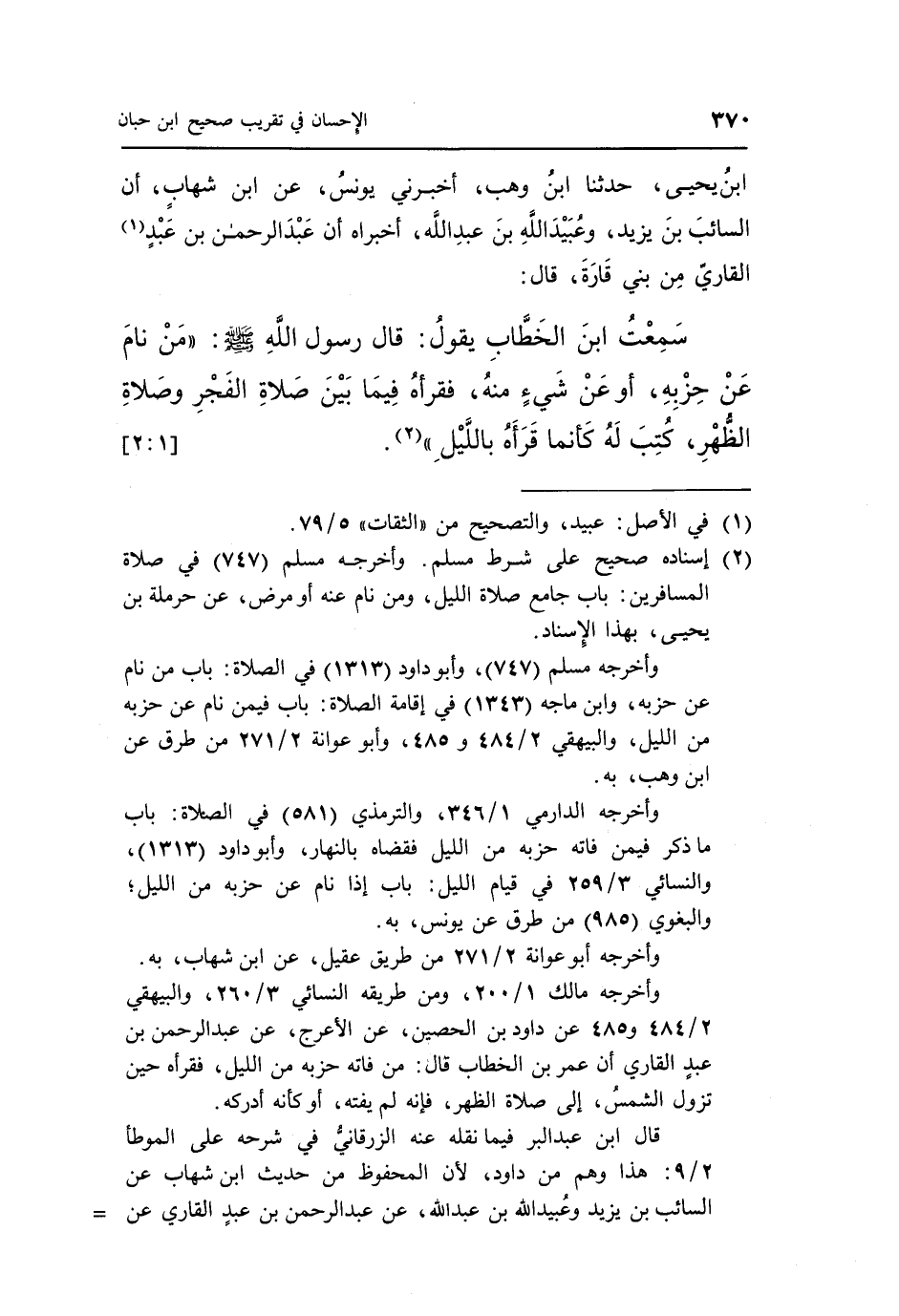 بْنُ يَحْيَى، حَدَّثَنَا ابْنُ وَهْبٍ، أَخْبَرَنِي يُونُسُ، عَنِ ابْنِ شِهَابٍ، أَنَّ السَّائِبَ بْنَ يَزِيدَ، وَعُبَيْدَ اللَّهِ بْنَ عَبْدِ اللَّهِ أَخْبَرَاهُ، أَنَّ عَبْدَ الرَّحْمَنِ بْنَ عَبْدِ (¬1) الْقَارِيِّ مِنْ بَنِي قَارَةَ، قَالَ: سَمِعْتُ ابْنَ الْخَطَّابِ، يَقُولُ: قَالَ رَسُولُ اللَّهِ صَلَّى اللَّهُ عَلَيْهِ وَسَلَّمَ: «مَنْ نَامَ عَنْ حِزْبِهِ، أَوْ عَنْ شَيْءٍ مِنْهُ، فَقَرَأَهُ فِيمَا بَيْنَ صَلَاةِ الْفَجْرِ وَصَلَاةِ الظُّهْرِ، كُتِبَ لَهُ كَأَنَّمَا قَرَأَهُ بِاللَّيْلِ» (¬2) . [1: 2]