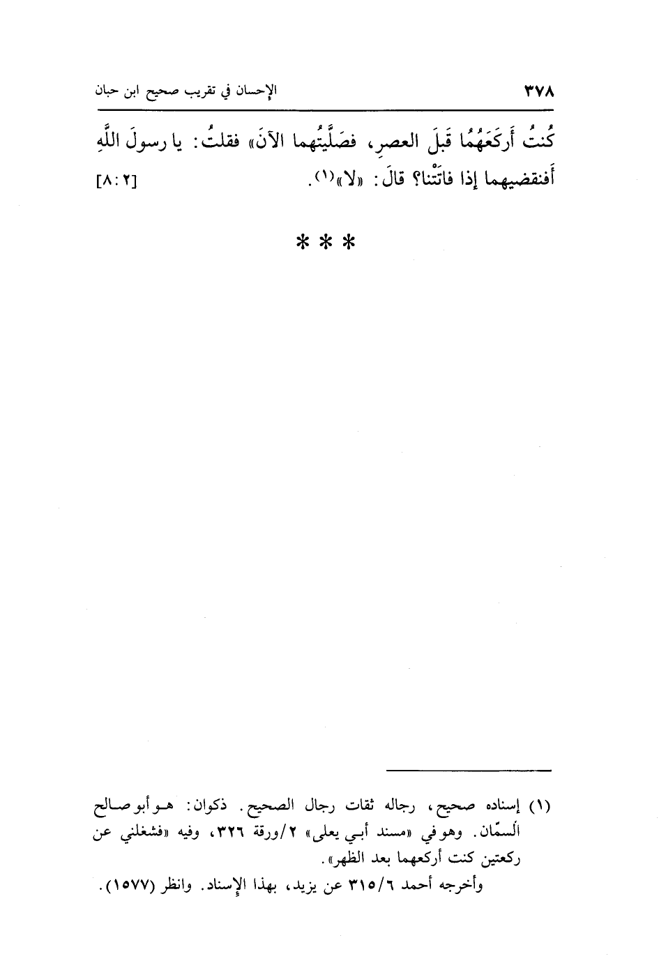 كُنْتُ أَرْكَعُهُمَا قَبْلَ الْعَصْرِ، فَصَلَّيْتُهُمَا الْآنَ» ، فَقُلْتُ: يَا رَسُولَ اللَّهِ، أَفَنَقْضِيهِمَا إِذَا فَاتَتْنَا؟ قَالَ: «لَا» . (¬1) . [2: 8]