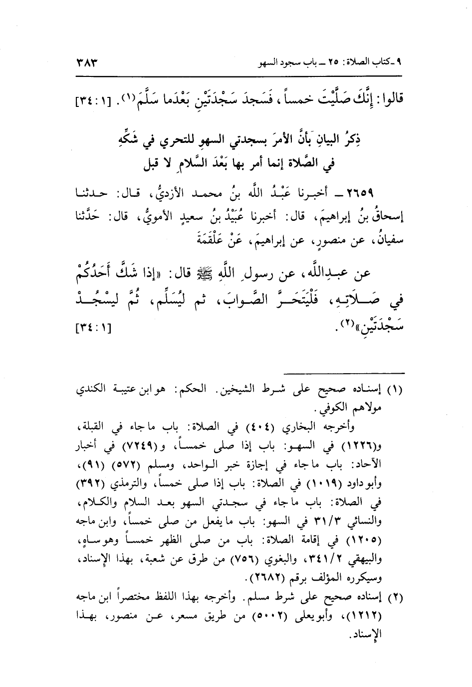 2659 - أَخْبَرَنَا عَبْدُ اللَّهِ بْنُ مُحَمَّدٍ الْأَزْدِيُّ، قَالَ: حَدَّثَنَا إِسْحَاقُ بْنُ إِبْرَاهِيمَ، قَالَ: أَخْبَرَنَا عُبَيْدُ بْنُ سَعِيدٍ الْأُمَوِيُّ، قَالَ: حَدَّثَنَا سُفْيَانُ، عَنْ مَنْصُورٍ، عَنْ إِبْرَاهِيمَ، عَنْ عَلْقَمَةَ، عَنْ عَبْدِ اللَّهِ، عَنْ رَسُولِ اللَّهِ صَلَّى اللَّهُ عَلَيْهِ وَسَلَّمَ، قَالَ: «إِذَا شَكَّ أَحَدُكُمْ فِي صَلَاتِهِ، فَلْيَتَحَرَّ الصَّوَابَ ثُمَّ لْيُسَلِّمْ، ثُمَّ لْيَسْجُدْ سَجْدَتَيْنِ» (¬2) . [1: 34]