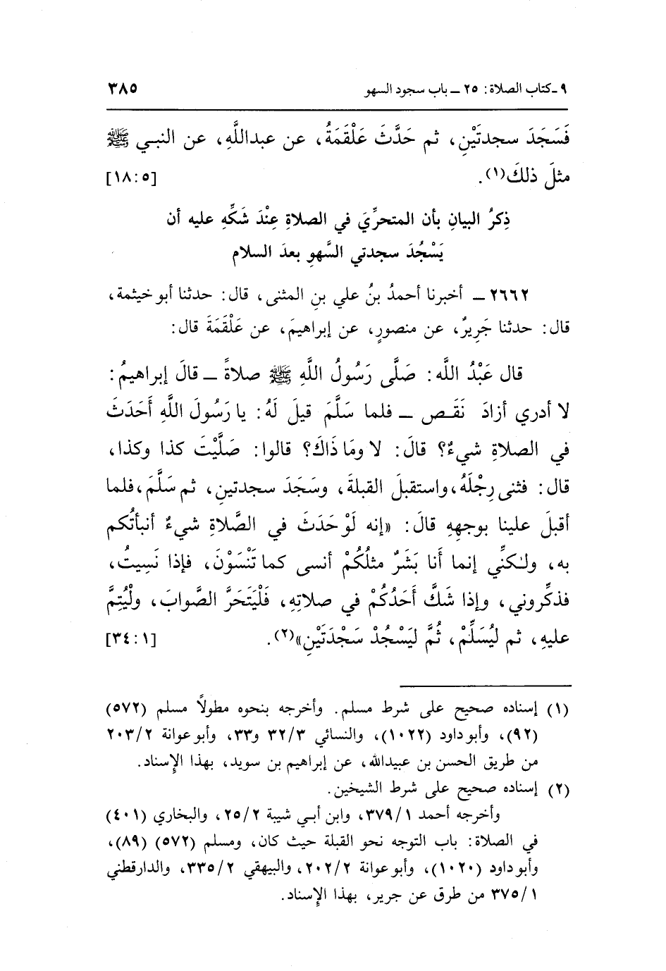 2662 - أَخْبَرَنَا أَحْمَدُ بْنُ عَلِيِّ بْنِ الْمُثَنَّى، قَالَ: حَدَّثَنَا أَبُو خَيْثَمَةَ، قَالَ: حَدَّثَنَا جَرِيرٌ، عَنْ مَنْصُورٍ، عَنْ إِبْرَاهِيمَ، عَنْ عَلْقَمَةَ، قَالَ: قَالَ عَبْدُ اللَّهِ: صَلَّى رَسُولُ اللَّهِ صَلَّى اللَّهُ عَلَيْهِ وَسَلَّمَ صَلَاةً - قَالَ إِبْرَاهِيمُ: لَا أَدْرِي أَزَادَ نَقَصَ - فَلَمَّا سَلَّمَ قِيلَ لَهُ: يَا رَسُولَ اللَّهِ، أَحَدَثَ فِي الصَّلَاةِ شَيْءٌ؟ قَالَ: «لَا، وَمَا ذَاكَ؟» قَالُوا: صَلَّيْتَ كَذَا وَكَذَا، قَالَ: فَثَنَى رِجْلَهُ، وَاسْتَقْبَلَ الْقِبْلَةَ، وَسَجَدَ سَجْدَتَيْنِ ثُمَّ سَلَّمَ، فَلَمَّا أَقْبَلَ عَلَيْنَا بِوَجْهِهِ قَالَ: «إِنَّهُ لَوْ حَدَثَ فِي الصَّلَاةِ شَيْءٌ أَنْبَأْتُكُمْ بِهِ، وَلَكِنِّي إِنَّمَا أَنَا بَشَرٌ مِثْلُكُمْ، أَنْسَى كَمَا تَنْسَوْنَ، فَإِذَا نَسِيتُ فَذَكِّرُونِي، وَإِذَا شَكَّ أَحَدُكُمْ فِي صَلَاتِهِ، فَلْيَتَحَرَّ الصَّوَابَ، وَلْيُتِمَّ عَلَيْهِ، ثُمَّ لْيُسَلِّمْ، ثُمَّ لْيَسْجُدْ سَجْدَتَيْنِ» (¬2) . [1: 34]