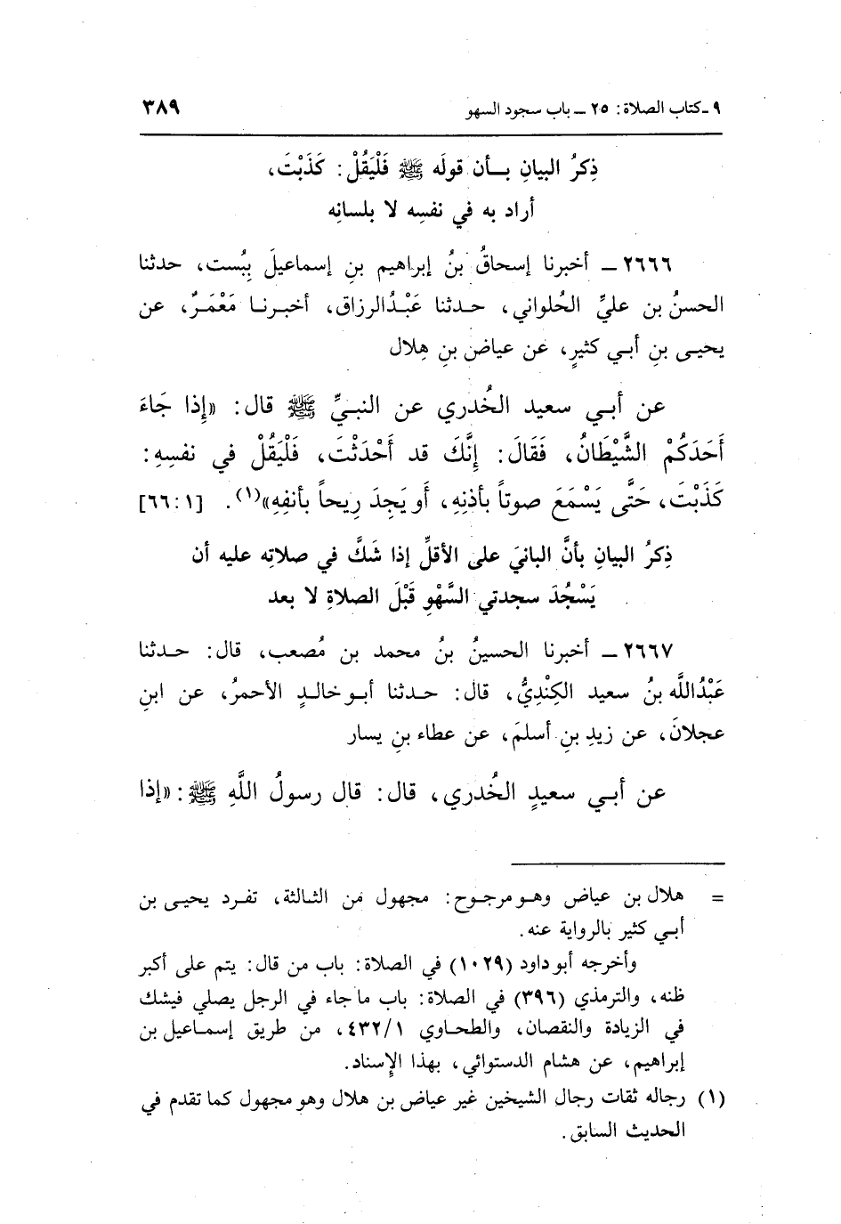 2666 - أَخْبَرَنَا إِسْحَاقُ بْنُ إِبْرَاهِيمَ بْنِ إِسْمَاعِيلَ بِبُسْتَ، حَدَّثَنَا الْحَسَنُ بْنُ عَلِيٍّ الْحُلْوَانِيُّ، حَدَّثَنَا عَبْدُ الرَّزَّاقِ، أَخْبَرَنَا مَعْمَرٌ، عَنْ يَحْيَى بْنِ أَبِي كَثِيرٍ، عَنْ عِيَاضِ بْنِ هِلَالٍ، عَنْ أَبِي سَعِيدٍ الْخُدْرِيِّ، عَنِ النَّبِيِّ صَلَّى اللَّهُ عَلَيْهِ وَسَلَّمَ، قَالَ: «إِذَا جَاءَ أَحَدَكُمُ الشَّيْطَانُ فَقَالَ: إِنَّكَ قَدْ أَحْدَثْتَ، فَلْيَقُلْ فِي نَفْسِهِ: كَذَبْتَ، حَتَّى يَسْمَعَ صَوْتًا بِأُذُنِهِ، أَوْ يَجِدَ رِيحًا بِأَنْفِهِ» (¬1) . [1: 66]