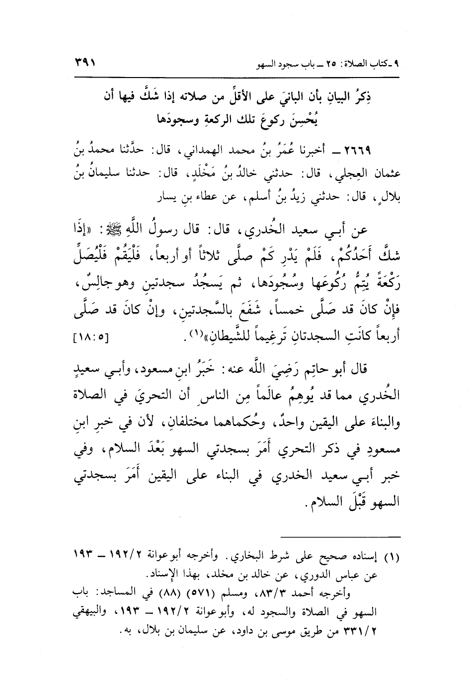 2669 - أَخْبَرَنَا عُمَرُ بْنُ مُحَمَّدٍ الْهَمْدَانِيُّ، قَالَ: حَدَّثَنَا مُحَمَّدُ بْنُ عُثْمَانَ الْعِجْلِيُّ، قَالَ: حَدَّثَنِي خَالِدُ بْنُ مَخْلَدٍ، قَالَ: حَدَّثَنَا سُلَيْمَانُ بْنُ بِلَالٍ، قَالَ: حَدَّثَنِي زَيْدُ بْنُ أَسْلَمَ، عَنْ عَطَاءِ بْنِ يَسَارٍ، عَنْ أَبِي سَعِيدٍ الْخُدْرِيِّ، قَالَ: قَالَ رَسُولُ اللَّهِ صَلَّى اللَّهُ عَلَيْهِ وَسَلَّمَ: «إِذَا شَكَّ أَحَدُكُمْ، فَلَمْ يَدْرِ كَمْ صَلَّى ثَلَاثًا أَوْ أَرْبَعًا، فَلْيَقُمْ فَلْيُصَلِّ رَكْعَةً يُتِمُّ رُكُوعَهَا وَسُجُودَهَا، ثُمَّ يَسْجُدْ سَجْدَتَيْنِ وَهُوَ جَالِسٌ، فَإِنْ كَانَ قَدْ صَلَّى خَمْسًا شَفَعَ بِالسَّجْدَتَيْنِ، وَإِنْ كَانَ قَدْ صَلَّى أَرْبَعًا كَانَتِ السَّجْدَتَانِ تَرْغِيمًا لِلشَّيْطَانِ» (¬1) . [5: 18]