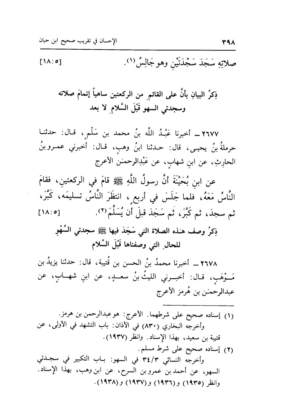 2677 - أَخْبَرَنَا عَبْدُ اللَّهِ بْنُ مُحَمَّدِ بْنِ سَلْمٍ، قَالَ: حَدَّثَنَا حَرْمَلَةُ بْنُ يَحْيَى، قَالَ: حَدَّثَنَا ابْنُ وَهْبٍ، قَالَ: أَخْبَرَنِي عَمْرُو بْنُ الْحَارِثِ، عَنِ ابْنِ شِهَابٍ، عَنْ عَبْدِ الرَّحْمَنِ الْأَعْرَجِ، عَنِ ابْنِ بُحَيْنَةَ، «أَنَّ رَسُولَ اللَّهِ صَلَّى اللَّهُ عَلَيْهِ وَسَلَّمَ قَامَ فِي الرَّكْعَتَيْنِ، فَقَامَ النَّاسُ مَعَهُ، فَلَمَّا جَلَسَ فِي أَرْبَعٍ انْتَظَرَ النَّاسُ تَسْلِيمَهُ، كَبَّرَ ثُمَّ سَجَدَ، ثُمَّ كَبَّرَ ثُمَّ سَجَدَ قَبْلَ أَنْ يُسَلِّمَ» (¬2) . [5: 18]