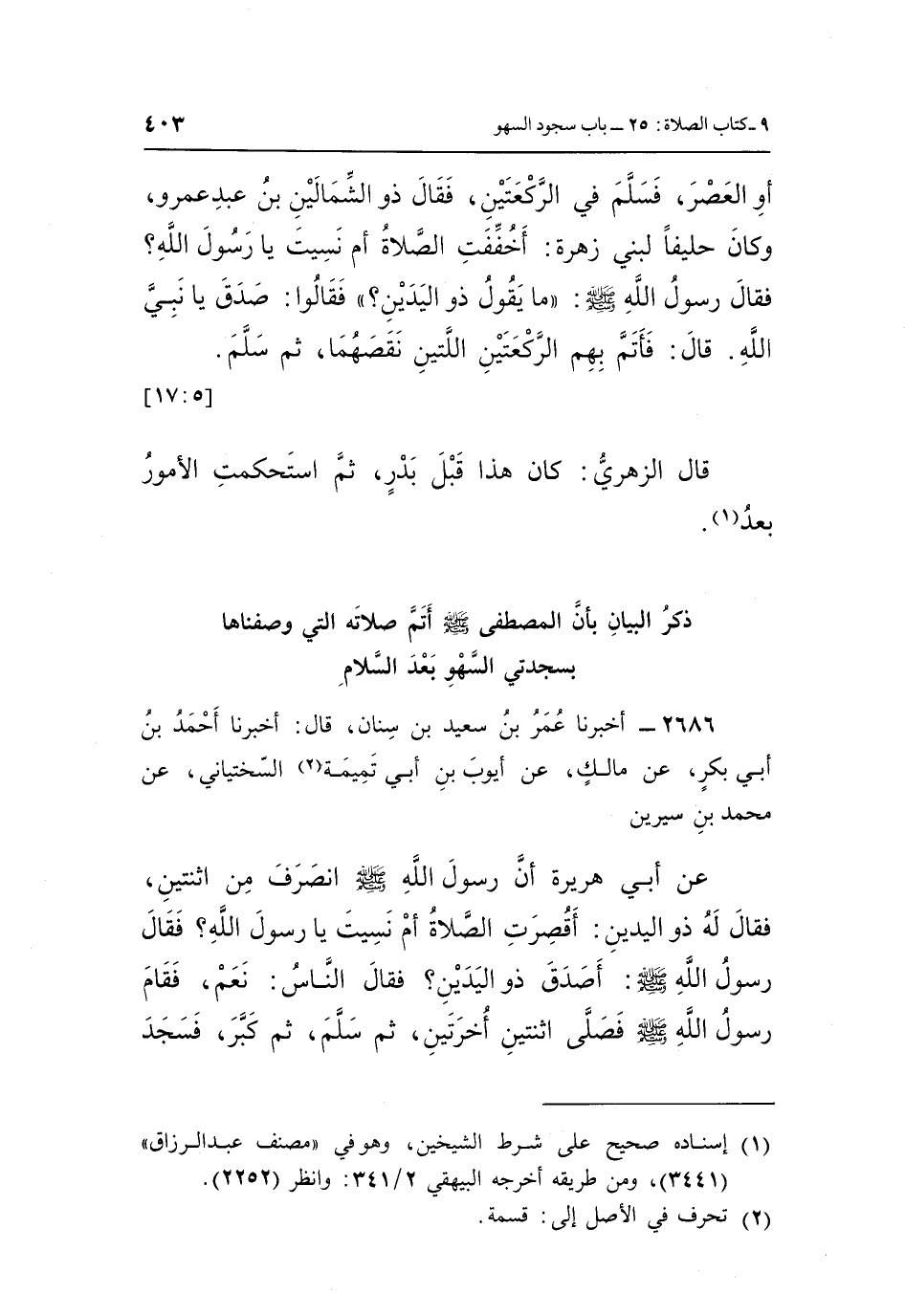 أَوِ الْعَصْرَ فَسَلَّمَ فِي الرَّكْعَتَيْنِ، فَقَالَ ذُو الشِّمَالَيْنِ بْنُ عَبْدِ عَمْرٍو وَكَانَ حَلِيفًا لِبَنِي زُهْرَةَ: أَخُفِّفَتِ الصَّلَاةُ، أَمْ نَسِيتَ يَا رَسُولَ اللَّهِ؟ فَقَالَ: رَسُولُ اللَّهِ صَلَّى اللَّهُ عَلَيْهِ وَسَلَّمَ: «مَا يَقُولُ ذُو الْيَدَيْنِ؟» فَقَالُوا: صَدَقَ يَا نَبِيَّ اللَّهِ، قَالَ: فَأَتَمَّ بِهِمُ الرَّكْعَتَيْنِ اللَّتَيْنِ نَقَصَهُمَا، ثُمَّ سَلَّمَ. [5: 17]