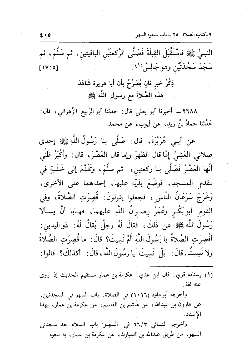 2688 - أَخْبَرَنَا أَبُو يَعْلَى، قَالَ: حَدَّثَنَا أَبُو الرَّبِيعِ الزَّهْرَانِيُّ، قَالَ: حَدَّثَنَا حَمَّادُ بْنُ زَيْدٍ، عَنْ أَيُّوبَ، عَنْ مُحَمَّدٍ، عَنْ أَبِي هُرَيْرَةَ، قَالَ: صَلَّى بِنَا رَسُولُ اللَّهِ صَلَّى اللَّهُ عَلَيْهِ وَسَلَّمَ إِحْدَى صَلَاتَيِ الْعَشِيِّ - إِمَّا قَالَ: الظُّهْرَ، وَإِمَّا قَالَ: الْعَصْرَ، قَالَ: وَأَكْبَرُ ظَنِّي أَنَّهَا الْعَصْرُ - فَصَلَّى بِنَا رَكْعَتَيْنِ، ثُمَّ سَلَّمَ، وَتَقَدَّمَ إِلَى خَشَبَةٍ فِي مُقَدَّمِ الْمَسْجِدِ، فَوَضَعَ يَدَيْهِ عَلَيْهَا، إِحْدَاهُمَا عَلَى الْأُخْرَى، وَخَرَجَ سَرَعَانُ النَّاسِ فَجَعَلُوا يَقُولُونَ: قُصِرَتِ الصَّلَاةُ، وَفِي الْقَوْمِ أَبُو بَكْرٍ، وَعُمَرُ رِضْوَانُ اللَّهِ عَلَيْهِمَا، فَهَابَا أَنْ يَسْأَلَا رَسُولَ اللَّهِ صَلَّى اللَّهُ عَلَيْهِ وَسَلَّمَ عَنْ ذَلِكَ، فَقَالَ لَهُ رَجُلٌ يُقَالُ لَهُ ذُو الْيَدَيْنِ: أَقُصِرَتِ الصَّلَاةُ يَا رَسُولَ اللَّهِ أَمْ نَسِيتَ؟ قَالَ: «مَا قُصِرَتِ الصَّلَاةُ، وَلَا نَسِيتُ» ، قَالَ: بَلْ نَسِيتَ يَا رَسُولَ اللَّهِ، قَالَ: «أَكَذَلِكَ؟» قَالُوا:
