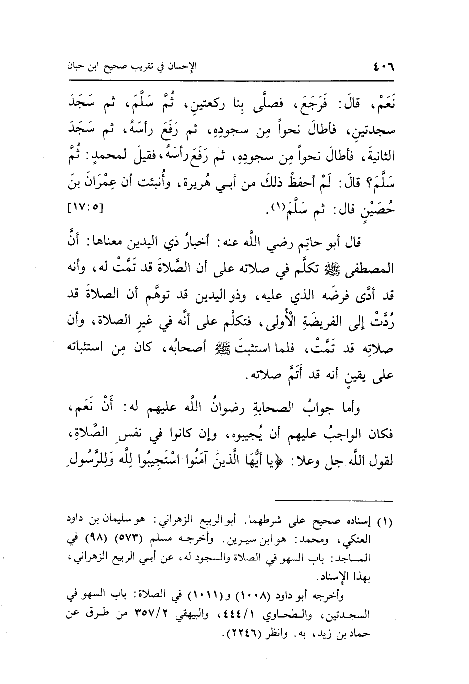 قَالَ أَبُو حَاتِمٍ رَضِيَ اللَّهُ عَنْهُ: «أَخْبَارُ ذِي الْيَدَيْنِ مَعْنَاهَا: أَنَّ الْمُصْطَفَى صَلَّى اللَّهُ عَلَيْهِ وَسَلَّمَ تَكَلَّمَ فِي صَلَاتِهِ عَلَى أَنَّ الصَّلَاةَ قَدْ تَمَّتْ لَهُ، وَأَنَّهُ قَدْ أَدَّى فَرْضَهُ الَّذِي عَلَيْهِ، وَذُو الْيَدَيْنِ قَدْ تَوَهَّمَ أَنَّ الصَّلَاةَ قَدْ رُدَّتْ إِلَى الْفَرِيضَةِ الْأُولَى، فَتَكَلَّمَ عَلَى أَنَّهُ فِي غَيْرِ الصَّلَاةِ، وَأَنَّ صَلَاتَهُ قَدْ تَمَّتْ، فَلَمَّا اسْتَثْبَتَ صَلَّى اللَّهُ عَلَيْهِ وَسَلَّمَ أَصْحَابَهُ، كَانَ مِنَ اسْتِثْبَاتِهِ عَلَى يَقِينٍ أَنَّهُ قَدْ أَتَمَّ صَلَاتَهُ.