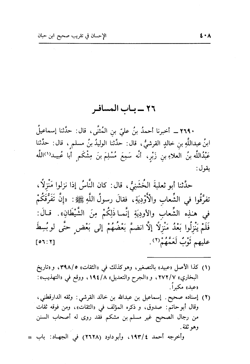 2690 - أَخْبَرَنَا أَحْمَدُ بْنُ عَلِيِّ بْنِ الْمُثَنَّى، قَالَ: حَدَّثَنَا إِسْمَاعِيلُ بْنُ عَبْدِ اللَّهِ بْنِ خَالِدٍ الْقُرَشِيُّ، قَالَ: حَدَّثَنَا الْوَلِيدُ بْنُ مُسْلِمٍ، قَالَ: حَدَّثَنَا عَبْدُ اللَّهِ بْنُ الْعَلَاءِ بْنِ زَبْرٍ، أَنَّهُ سَمِعَ مُسْلِمَ بْنَ مِشْكَمٍ أَبَا عُبَيْدِ (¬1) اللَّهِ، يَقُولُ: حَدَّثَنَا أَبُو ثَعْلَبَةَ الْخُشَنِيُّ، قَالَ: كَانَ النَّاسُ إِذَا نَزَلُوا مَنْزِلًا تَفَرَّقُوا فِي الشِّعَابِ وَالْأَوْدِيَةِ، فَقَالَ رَسُولُ اللَّهِ صَلَّى اللَّهُ عَلَيْهِ وَسَلَّمَ: «إِنَّ تَفَرُّقَكُمْ فِي هَذِهِ الشِّعَابِ وَالْأَوْدِيَةِ إِنَّمَا ذَلِكُمْ مِنَ الشَّيْطَانِ» ، قَالَ: فَلَمْ يَنْزِلُوا بَعْدُ مَنْزِلًا إِلَّا انْضَمَّ بَعْضُهُمْ إِلَى بَعْضٍ حَتَّى لَوْ بُسِطَ عَلَيْهِمْ ثَوْبٌ لَعَمَّهُمْ (¬2) . [2: 56]