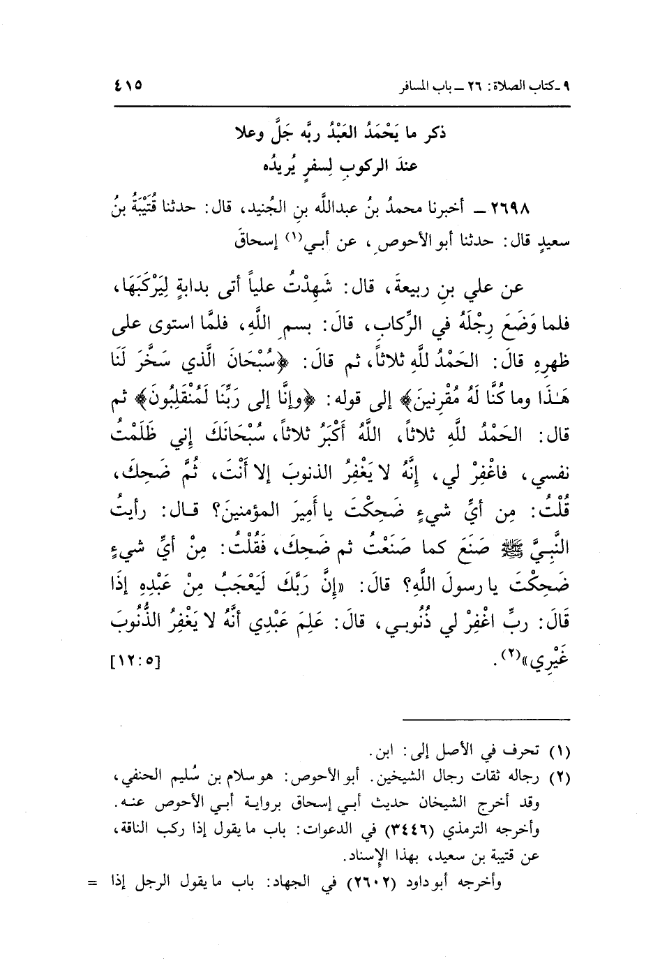 2698 - أَخْبَرَنَا مُحَمَّدُ بْنُ عَبْدِ اللَّهِ بْنِ الْجُنَيْدِ، قَالَ: حَدَّثَنَا قُتَيْبَةُ بْنُ سَعِيدٍ، قَالَ: حَدَّثَنَا أَبُو الْأَحْوَصِ، عَنْ أَبِي (¬1) إِسْحَاقَ، عَنْ عَلِيِّ بْنِ رَبِيعَةَ، قَالَ: شَهِدْتُ عَلِيًّا أُتِيَ بِدَابَّةٍ لِيَرْكَبَهَا، فَلَمَّا وَضَعَ رِجْلَهُ فِي الرِّكَابِ، قَالَ: بِسْمِ اللَّهِ، فَلَمَّا اسْتَوَى عَلَى ظَهْرِهِ، قَالَ: الْحَمْدُ لِلَّهِ ثَلَاثًا، ثُمَّ قَالَ: {سُبْحَانَ الَّذِي سَخَّرَ لَنَا هَذَا وَمَا كُنَّا لَهُ مُقْرِنِينَ} إِلَى قَوْلِهِ: {وَإِنَّا إِلَى رَبِّنَا لَمُنْقَلِبُونَ} ، ثُمَّ قَالَ: الْحَمْدُ لِلَّهِ ثَلَاثًا، اللَّهُ أَكْبَرُ ثَلَاثًا، سُبْحَانَكَ إِنِّي ظَلَمْتُ نَفْسِي فَاغْفِرْ لِي، إِنَّهُ لَا يَغْفِرُ الذُّنُوبَ إِلَّا أَنْتَ، ثُمَّ ضَحِكَ، قُلْتُ: مِنْ أَيِّ شَيْءٍ ضَحِكْتَ يَا أَمِيرَ الْمُؤْمِنِينَ؟ قَالَ: رَأَيْتُ النَّبِيَّ صَلَّى اللَّهُ عَلَيْهِ وَسَلَّمَ صَنَعَ كَمَا صَنَعْتُ ثُمَّ ضَحِكَ، فَقُلْتُ: مِنْ أَيِّ شَيْءٍ ضَحِكْتَ يَا رَسُولَ اللَّهِ؟ قَالَ: «إِنَّ رَبَّكَ لَيَعْجَبُ مِنْ عَبْدِهِ إِذَا قَالَ: رَبِّ اغْفِرْ لِي ذُنُوبِي، قَالَ: عَلِمَ عَبْدِي أَنَّهُ لَا يَغْفِرُ الذُّنُوبَ غَيْرِي» (¬2) . [5: 12]