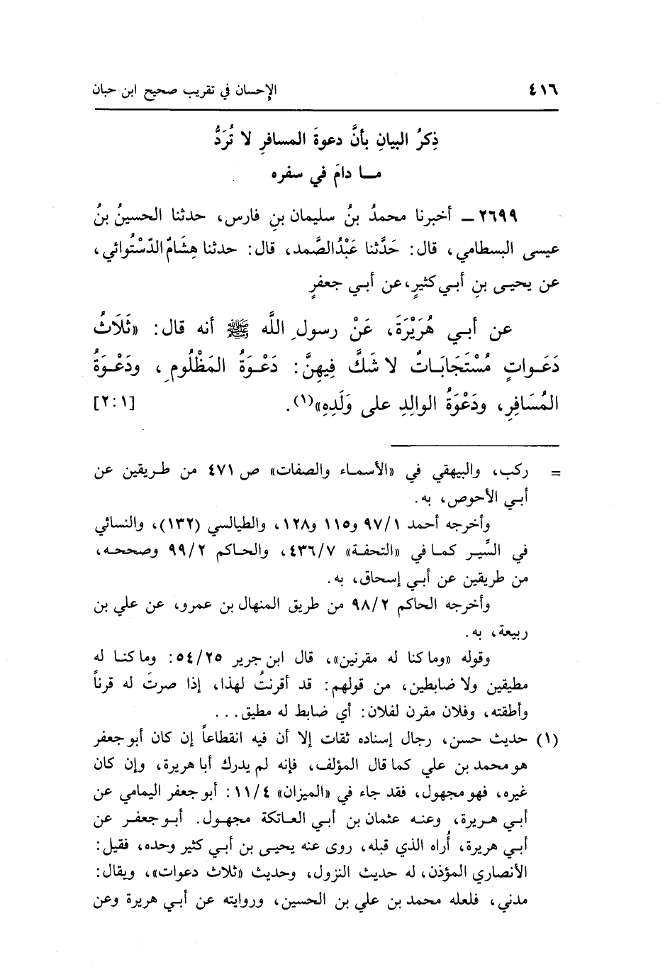 2699 - أَخْبَرَنَا مُحَمَّدُ بْنُ سُلَيْمَانَ بْنِ فَارِسٍ، حَدَّثَنَا الْحُسَيْنُ بْنُ عِيسَى الْبِسْطَامِيُّ، قَالَ: حَدَّثَنَا عَبْدُ الصَّمَدِ، قَالَ: حَدَّثَنَا هِشَامٌ الدَّسْتُوَائِيُّ، عَنْ يَحْيَى بْنِ أَبِي كَثِيرٍ، عَنْ أَبِي جَعْفَرٍ، عَنْ أَبِي هُرَيْرَةَ، عَنْ رَسُولِ اللَّهِ صَلَّى اللَّهُ عَلَيْهِ وَسَلَّمَ، أَنَّهُ قَالَ: «ثَلَاثُ دَعَوَاتٍ مُسْتَجَابَاتٌ لَا شَكَّ فِيهِنَّ: دَعْوَةُ الْمَظْلُومِ، وَدَعْوَةُ الْمُسَافِرِ، وَدَعْوَةُ الْوَالِدِ عَلَى وَلَدِهِ» (¬1) . [1: 2]