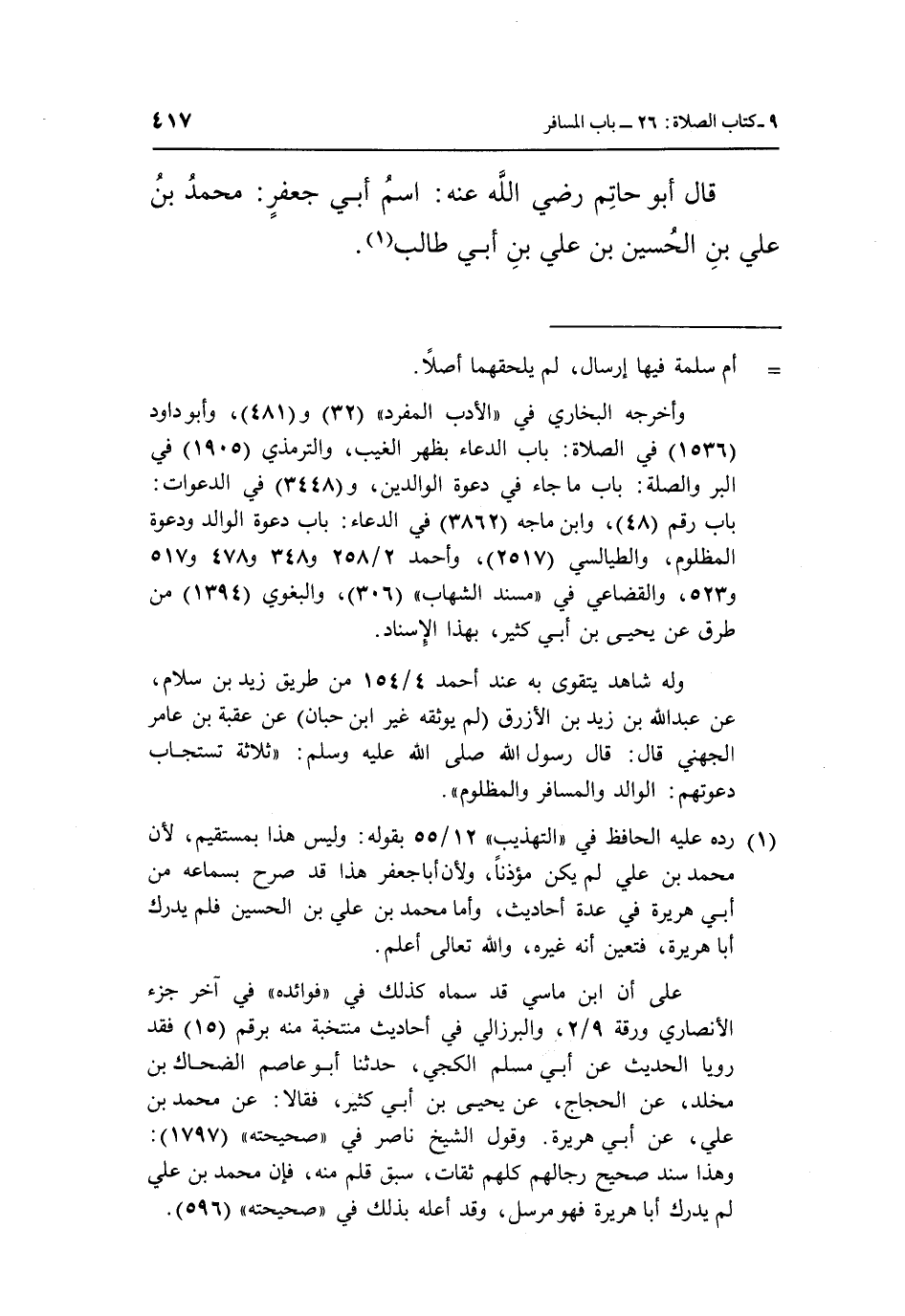 (¬1) رده عليه الحافظ في "التهذيب" 12/55 بقوله: وليس هذا بمستقيم، لأن محمد بن علي لم يكن مؤذنًا، ولأن أبا جعفر هذا قد صرح بسماعه من أبي هريرة في عدة أحاديث، وأما محمد بن علي بن الحسين فلم يدرك أبا هريرة، فتعين أنه غيره، والله تعالى أعلم.