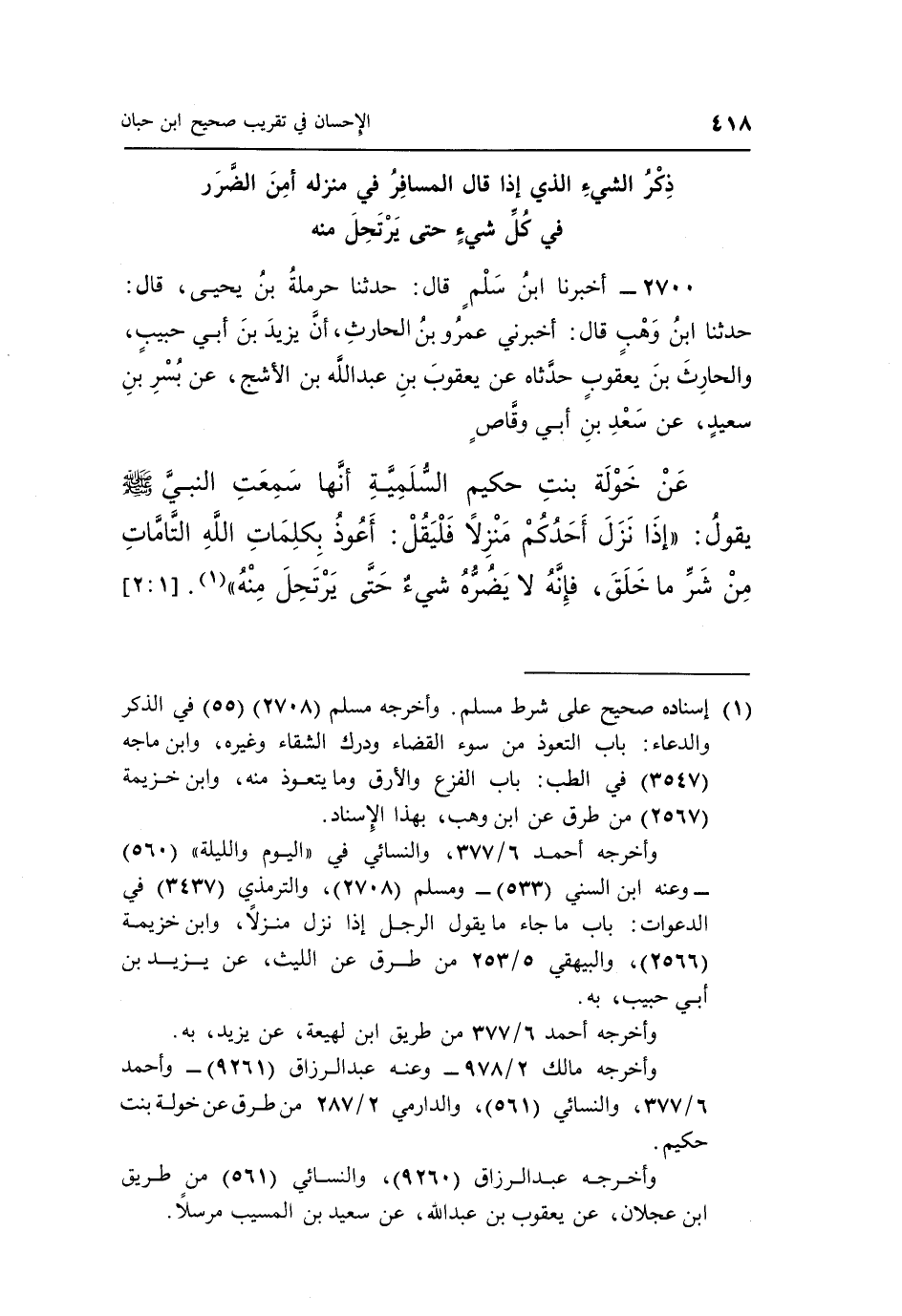 2700 - أَخْبَرَنَا ابْنُ سَلْمٍ، قَالَ: حَدَّثَنَا حَرْمَلَةُ بْنُ يَحْيَى، قَالَ: حَدَّثَنَا ابْنُ وَهْبٍ، قَالَ: أَخْبَرَنِي عَمْرُو بْنُ الْحَارِثِ، أَنَّ يَزِيدَ بْنَ أَبِي حَبِيبٍ، وَالْحَارِثَ بْنَ يَعْقُوبَ حَدَّثَاهُ، عَنْ يَعْقُوبَ بْنِ عَبْدِ اللَّهِ بْنِ الْأَشَجِّ، عَنْ بُسْرِ بْنِ سَعِيدٍ، عَنْ سَعْدِ بْنِ أَبِي وَقَّاصٍ، عَنْ خَوْلَةَ بِنْتِ حَكِيمٍ السُّلَمِيَّةِ، أَنَّهَا سَمِعَتِ النَّبِيَّ صَلَّى اللَّهُ عَلَيْهِ وَسَلَّمَ يَقُولُ: «إِذَا نَزَلَ أَحَدُكُمْ مَنْزِلًا فَلْيَقُلْ: أَعُوذُ بِكَلِمَاتِ اللَّهِ التَّامَّاتِ مِنْ شَرِّ مَا خَلَقَ، فَإِنَّهُ لَا يَضُرُّهُ شَيْءٌ حَتَّى يَرْتَحِلَ مِنْهُ» (¬1) . [1: 2]