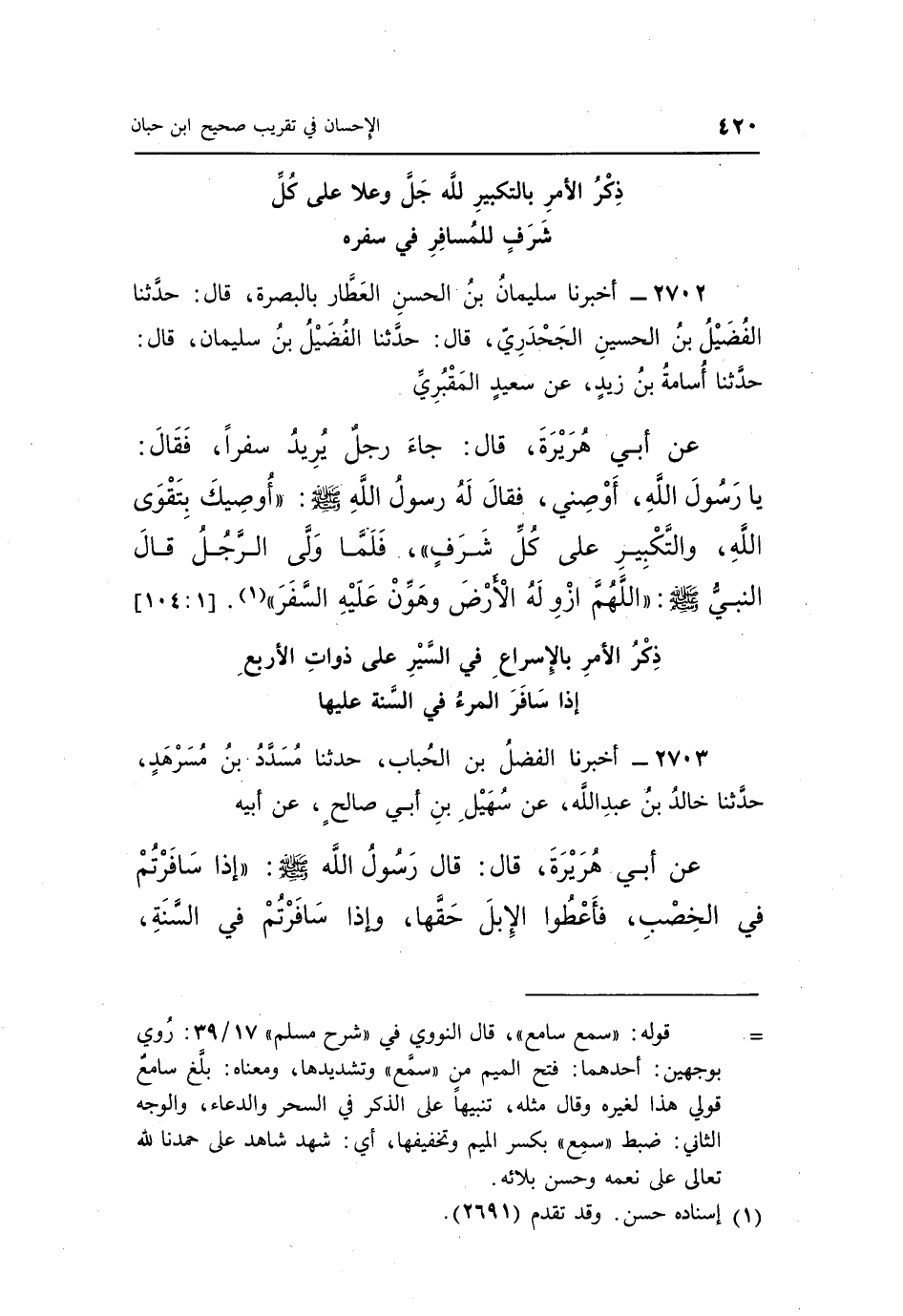 2702 - أَخْبَرَنَا سُلَيْمَانُ بْنُ الْحَسَنِ الْعَطَّارُ بِالْبَصْرَةِ، قَالَ: حَدَّثَنَا الْفُضَيْلُ بْنُ الْحُسَيْنِ الْجَحْدَرِيُّ، قَالَ: حَدَّثَنَا الْفُضَيْلُ بْنُ سُلَيْمَانَ، قَالَ: حَدَّثَنَا أُسَامَةُ بْنُ زَيْدٍ، عَنْ سَعِيدٍ الْمَقْبُرِيِّ، عَنْ أَبِي هُرَيْرَةَ، قَالَ: جَاءَ رَجُلٌ يُرِيدُ سَفَرًا، فَقَالَ: يَا رَسُولَ اللَّهِ، أَوْصِنِي، فَقَالَ لَهُ رَسُولُ اللَّهِ صَلَّى اللَّهُ عَلَيْهِ وَسَلَّمَ: «أُوصِيكَ بِتَقْوَى اللَّهِ، وَالتَّكْبِيرِ عَلَى كُلِّ شَرَفٍ» ، فَلَمَّا وَلَّى الرَّجُلُ قَالَ النَّبِيُّ صَلَّى اللَّهُ عَلَيْهِ وَسَلَّمَ: «اللَّهُمَّ ازْوِ لَهُ الْأَرْضَ، وَهَوِّنْ عَلَيْهِ السَّفَرَ» (¬1) . [1: 104]