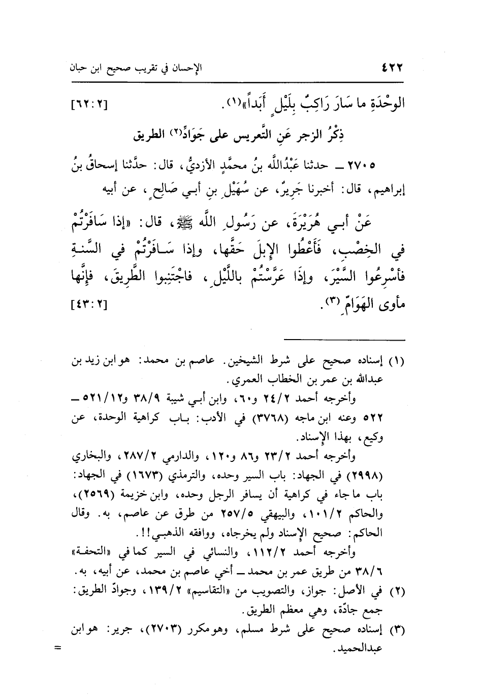 2705 - حَدَّثَنَا عَبْدُ اللَّهِ بْنُ مُحَمَّدٍ الْأَزْدِيُّ، قَالَ: حَدَّثَنَا إِسْحَاقُ بْنُ إِبْرَاهِيمَ، قَالَ: أَخْبَرَنَا جَرِيرٌ، عَنْ سُهَيْلِ بْنِ أَبِي صَالِحٍ، عَنْ أَبِيهِ، عَنْ أَبِي هُرَيْرَةَ، عَنْ رَسُولِ اللَّهِ صَلَّى اللَّهُ عَلَيْهِ وَسَلَّمَ، قَالَ: «إِذَا سَافَرْتُمْ فِي الْخِصْبِ فَأَعْطُوا الْإِبِلَ حَقَّهَا، وَإِذَا سَافَرْتُمْ فِي السَّنَةِ فَأَسْرِعُوا السَّيْرَ، وَإِذَا عَرَّسْتُمْ بِاللَّيْلِ فَاجْتَنِبُوا الطَّرِيقَ، فَإِنَّهَا مَأْوَى الْهَوَامِّ» (¬3) . [2: 43]