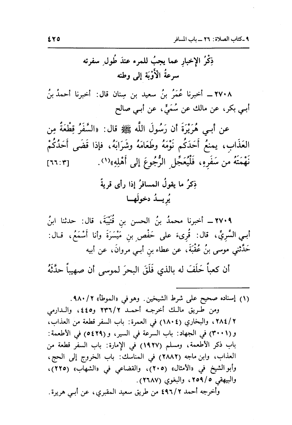 2708 - أَخْبَرَنَا عُمَرُ بْنُ سَعِيدِ بْنِ سِنَانٍ، قَالَ: أَخْبَرَنَا أَحْمَدُ بْنُ أَبِي بَكْرٍ، عَنْ مَالِكٍ، عَنْ سُمَيٍّ، عَنْ أَبِي صَالِحٍ، عَنْ أَبِي هُرَيْرَةَ، أَنَّ رَسُولَ اللَّهِ صَلَّى اللَّهُ عَلَيْهِ وَسَلَّمَ قَالَ: «السَّفَرُ قِطْعَةٌ مِنَ الْعَذَابِ، يَمْنَعُ أَحَدَكُمْ نَوْمَهُ وَطَعَامَهُ وَشَرَابَهُ، فَإِذَا قَضَى أَحَدُكُمْ نَهْمَتَهُ مِنْ سَفَرِهِ، فَلْيُعَجِّلِ الرُّجُوعَ إِلَى أَهْلِهِ» (¬1) . [3: 66]