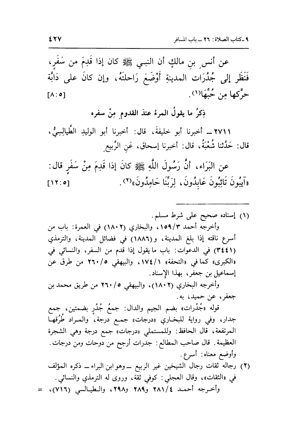 2711 - أَخْبَرَنَا أَبُو خَلِيفَةَ، قَالَ: أَخْبَرَنَا أَبُو الْوَلِيدِ الطَّيَالِسِيُّ، قَالَ: حَدَّثَنَا شُعْبَةُ، قَالَ: أَخْبَرَنَا أَبُو إِسْحَاقَ، عَنِ الرَّبِيعِ، عَنِ الْبَرَاءِ، أَنَّ رَسُولَ اللَّهِ صَلَّى اللَّهُ عَلَيْهِ وَسَلَّمَ كَانَ إِذَا قَدِمَ مِنْ سَفَرٍ قَالَ: «آيِبُونَ تَائِبُونَ عَابِدُونَ لِرَبِّنَا حَامِدُونَ» (¬2) . [5: 12]