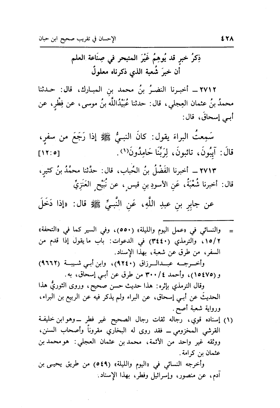 2712 - أَخْبَرَنَا النَّضْرُ بْنُ مُحَمَّدِ بْنِ الْمُبَارَكِ، قَالَ: حَدَّثَنَا مُحَمَّدُ بْنُ عُثْمَانَ الْعِجْلِيُّ، قَالَ: حَدَّثَنَا عُبَيْدُ اللَّهِ بْنُ مُوسَى، عَنْ فِطْرٍ، عَنْ أَبِي إِسْحَاقَ، قَالَ: سَمِعْتُ الْبَرَاءَ، يَقُولُ: كَانَ النَّبِيُّ صَلَّى اللَّهُ عَلَيْهِ وَسَلَّمَ إِذَا رَجَعَ مِنْ سَفَرٍ قَالَ: «آيِبُونَ، تَائِبُونَ، لِرَبِّنَا حَامِدُونَ» (¬1) . [5: 12]