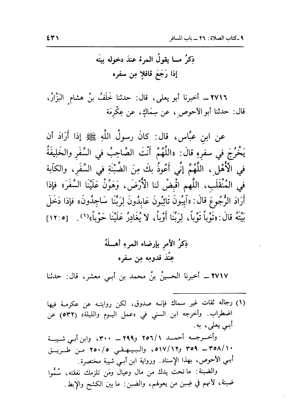 2716 - أَخْبَرَنَا أَبُو يَعْلَى، قَالَ: حَدَّثَنَا خَلَفُ بْنُ هِشَامٍ الْبَزَّارُ، قَالَ: حَدَّثَنَا أَبُو الْأَحْوَصِ، عَنْ سِمَاكٍ، عَنْ عِكْرِمَةَ، عَنِ ابْنِ عَبَّاسٍ، قَالَ: كَانَ رَسُولُ اللَّهِ صَلَّى اللَّهُ عَلَيْهِ وَسَلَّمَ إِذَا أَرَادَ أَنْ يَخْرُجَ فِي سَفَرِهِ، قَالَ: «اللَّهُمَّ أَنْتَ الصَّاحِبُ فِي السَّفَرِ وَالْخَلِيفَةُ فِي الْأَهْلِ، اللَّهُمَّ إِنِّي أَعُوذُ بِكَ مِنَ الضِّبْنَةِ فِي السَّفَرِ، وَالْكَآبَةِ فِي الْمُنْقَلَبِ، اللَّهُمَّ اقْبِضْ لَنَا الْأَرْضَ، وَهَوِّنْ عَلَيْنَا السَّفَرَ» ، فَإِذَا أَرَادَ الرُّجُوعَ، قَالَ: «آيِبُونَ تَائِبُونَ عَابِدُونَ لِرَبِّنَا سَاجِدُونَ» ، فَإِذَا دَخَلَ بَيْتَهُ، قَالَ: «تَوْبًا تَوْبًا، لِرَبِّنَا أَوْبًا، لَا يُغَادِرُ عَلَيْنَا حَوْبًا» (¬1) . [5: 12]