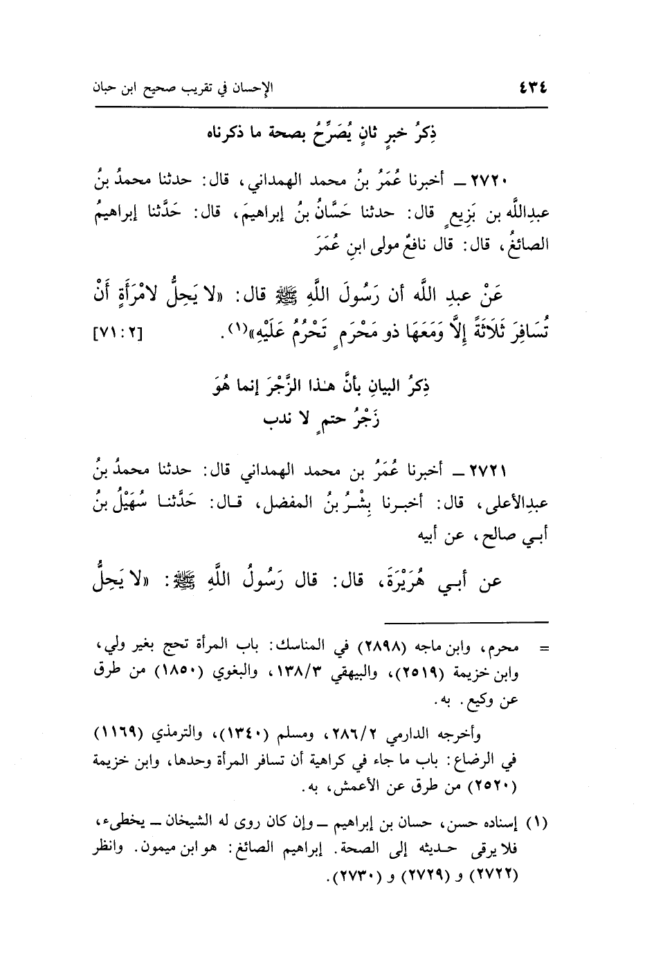 2720 - أَخْبَرَنَا عُمَرُ بْنُ مُحَمَّدٍ الْهَمْدَانِيُّ، قَالَ: حَدَّثَنَا مُحَمَّدُ بْنُ عَبْدِ اللَّهِ بْنِ بَزِيعٍ، قَالَ: حَدَّثَنَا حَسَّانُ بْنُ إِبْرَاهِيمَ، قَالَ: حَدَّثَنَا إِبْرَاهِيمُ الصَّائِغُ، قَالَ: قَالَ نَافِعٌ مَوْلَى ابْنِ عُمَرَ، عَنْ عَبْدِ اللَّهِ، أَنَّ رَسُولَ اللَّهِ صَلَّى اللَّهُ عَلَيْهِ وَسَلَّمَ، قَالَ: «لَا يَحِلُّ لِامْرَأَةٍ أَنْ تُسَافِرَ ثَلَاثَةً إِلَّا وَمَعَهَا ذُو مَحْرَمٍ تَحْرُمُ عَلَيْهِ» (¬1) . [2: 71]