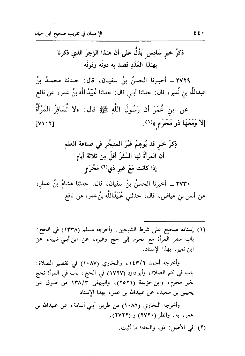 2729 - أَخْبَرَنَا الْحَسَنُ بْنُ سُفْيَانَ، قَالَ: حَدَّثَنَا مُحَمَّدُ بْنُ عَبْدِ اللَّهِ بْنِ نُمَيْرٍ، قَالَ: حَدَّثَنَا أَبِي، قَالَ: حَدَّثَنَا عُبَيْدُ اللَّهِ بْنُ عُمَرَ، عَنْ نَافِعٍ، عَنِ ابْنِ عُمَرَ، أَنَّ رَسُولَ اللَّهِ صَلَّى اللَّهُ عَلَيْهِ وَسَلَّمَ قَالَ: «لَا تُسَافِرُ الْمَرْأَةُ إِلَّا وَمَعَهَا ذُو مَحْرَمٍ» (¬1) . [2: 71]